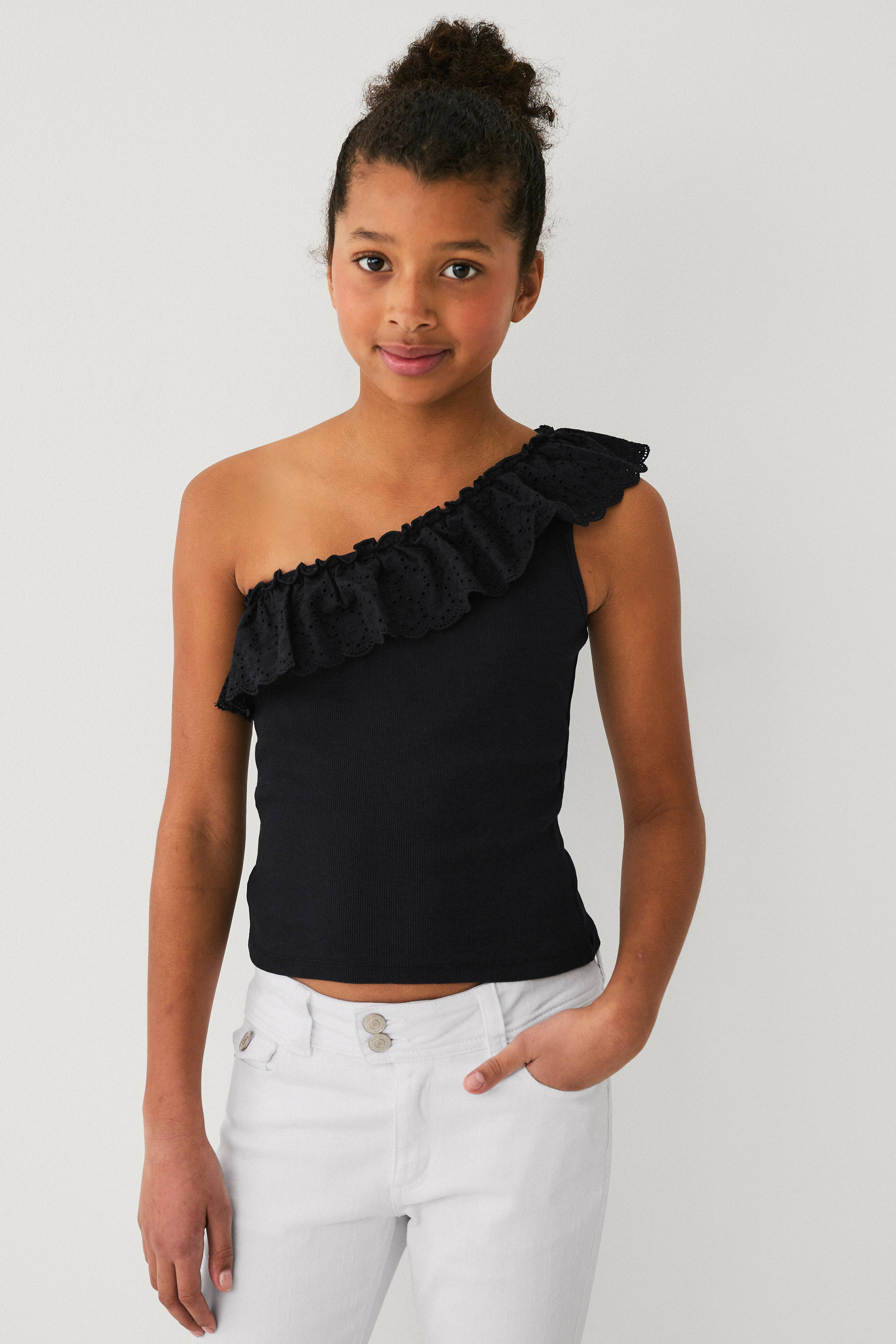 • Asymmetrisk øvre kant med hulbroderet volant• En skulderstrop