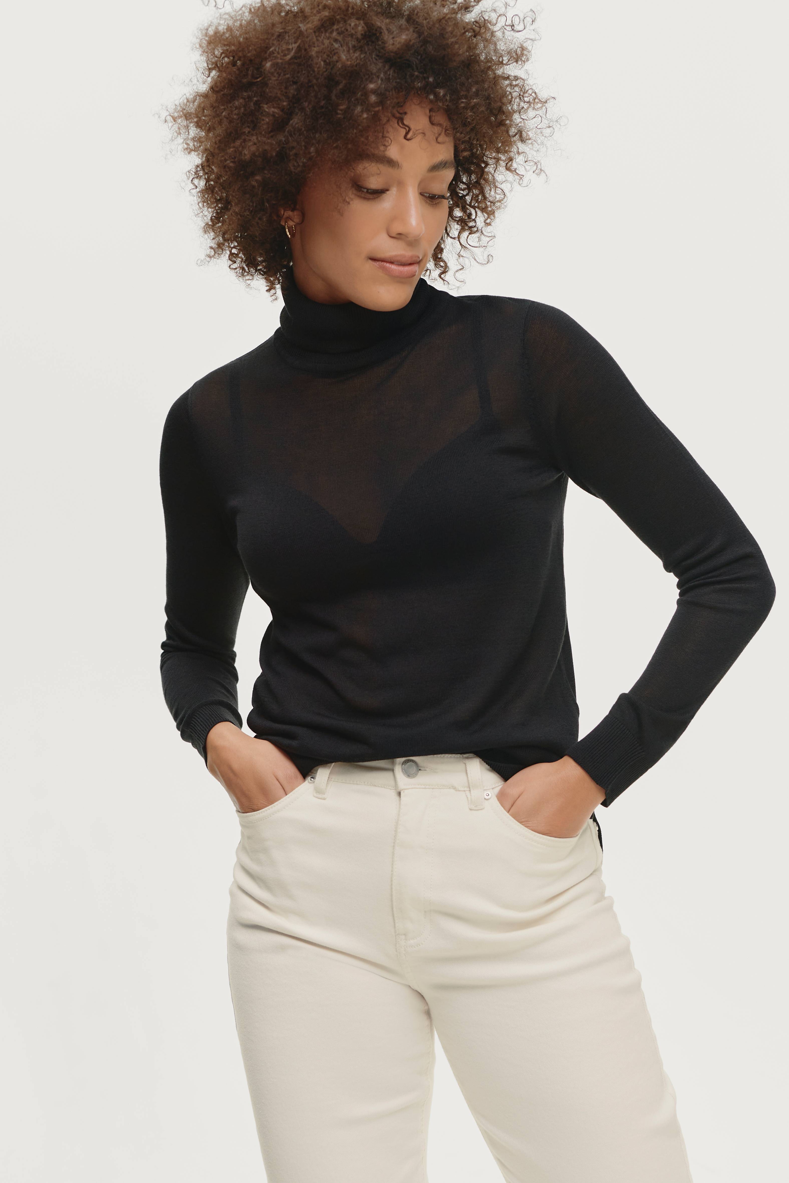 Rullekravebluse Frida i lidt tyndere, finstrikket kvalitet med høj, ribstrikket rullekrave. Også ribstrik i ærmekanten og kanten forneden, som desuden har slids i siderne. Længde ca. 63 cm i str. 34/36.