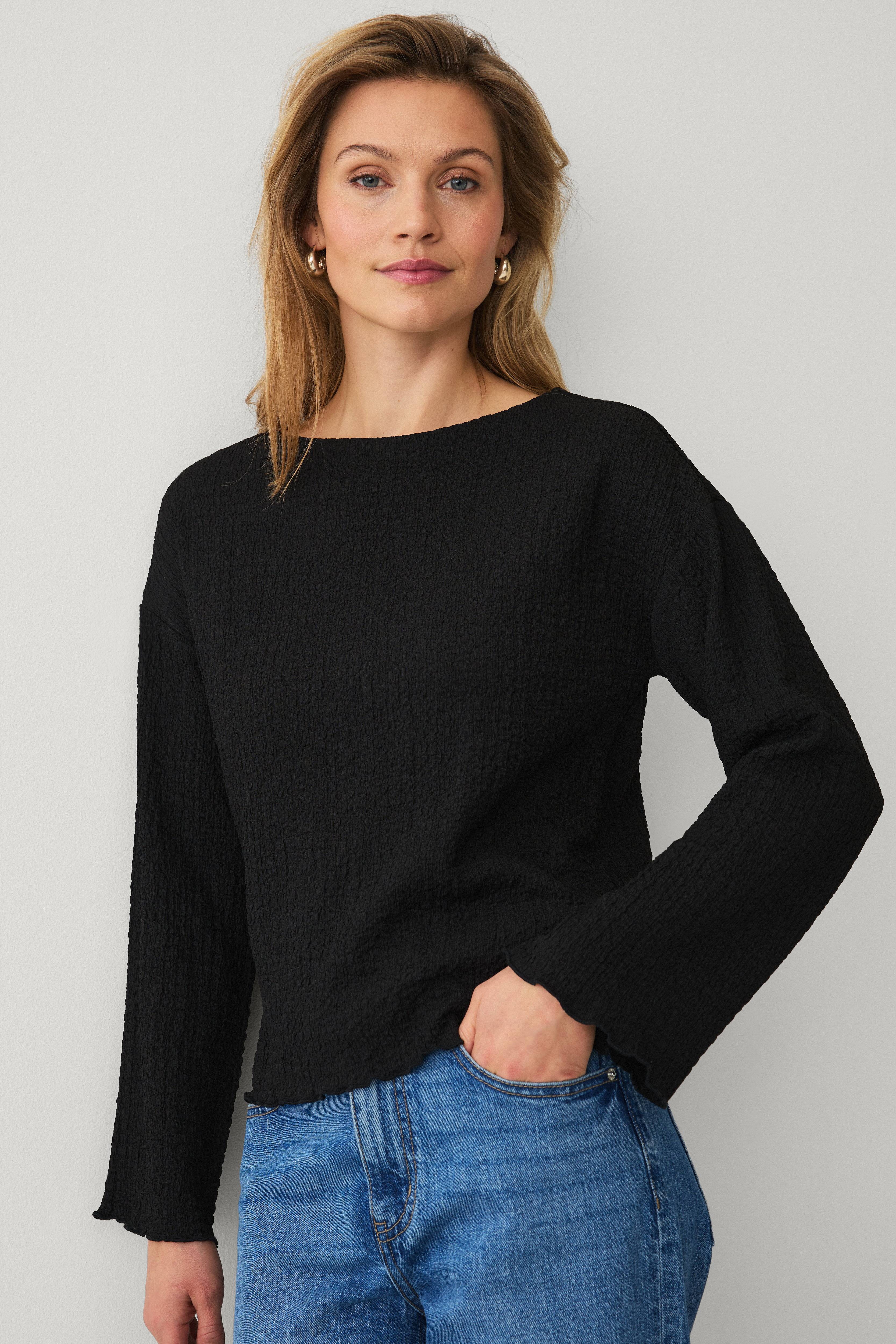 • Tynd, rynket top• Rund halsudskæring• Lange, brede ærmer• Bølgede kanter rundt om halsen, ved ærmeafslutningerne og nederst• Længde: 54 cm i størrelse S