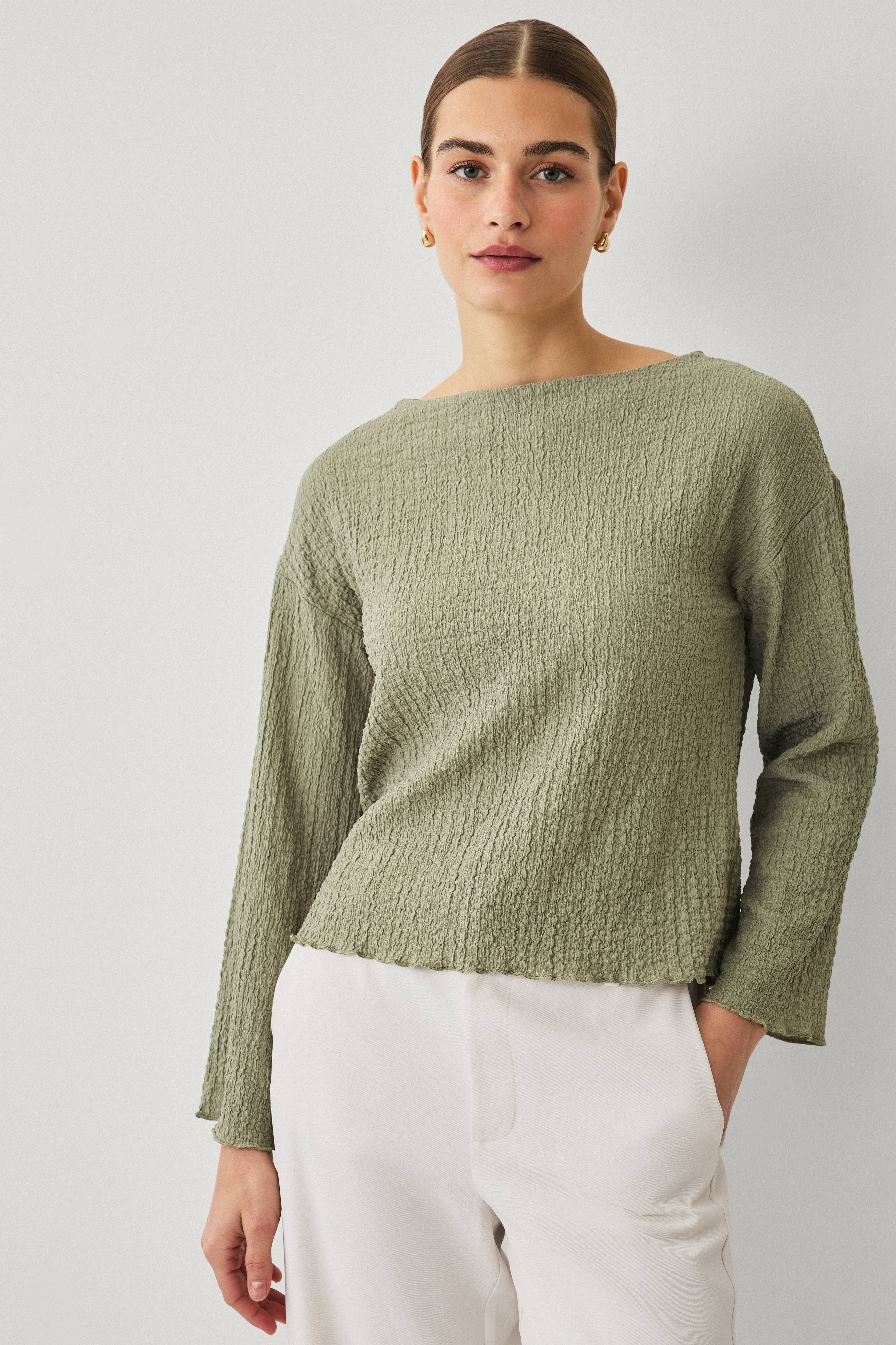 • Tynd, rynket top• Rund halsudskæring• Lange, brede ærmer• Bølgede kanter rundt om halsen, ved ærmeafslutningerne og nederst• Længde: 54 cm i størrelse S