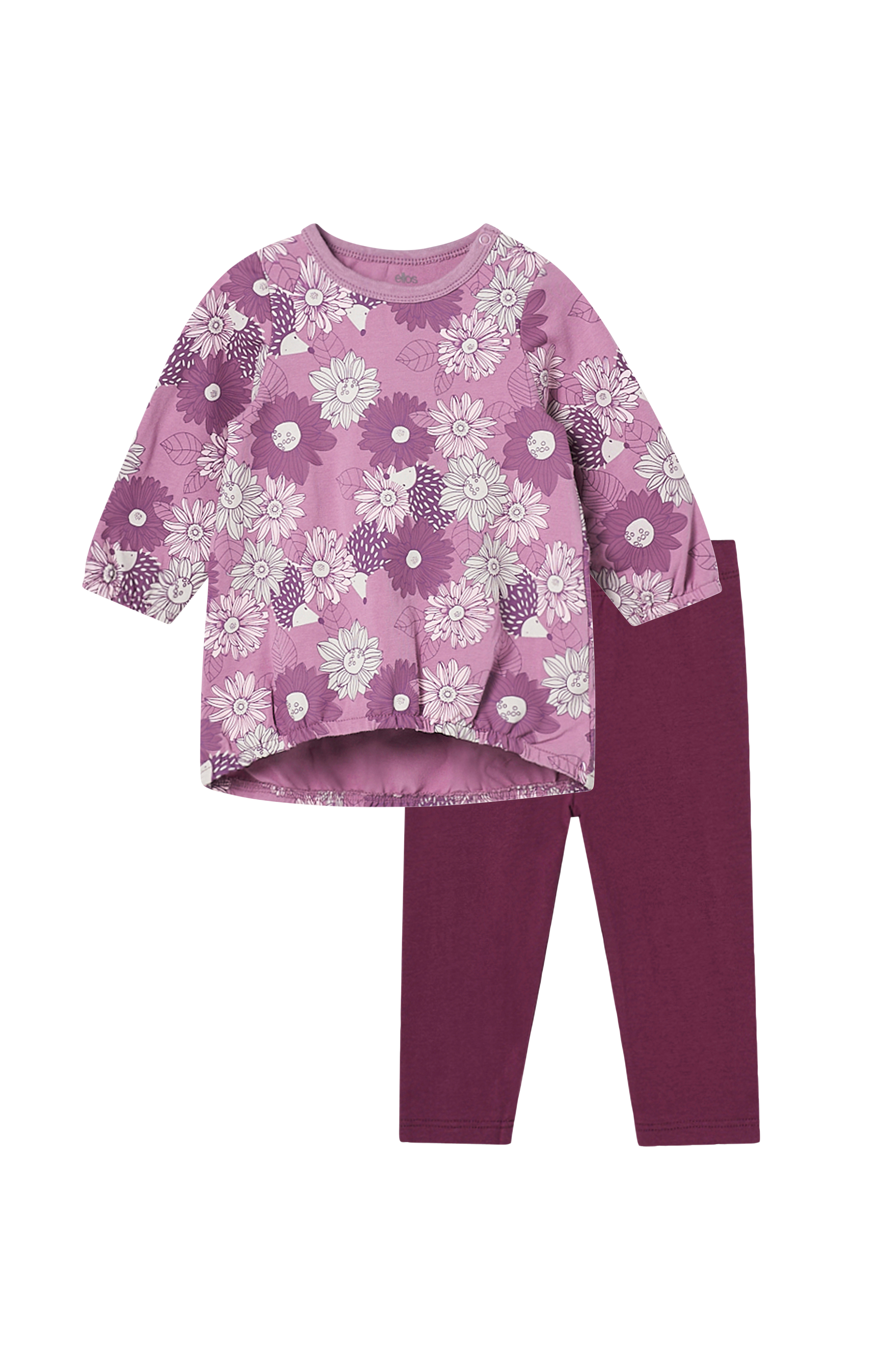 • Todelt sæt i bomuldsjersey • Langærmet kjole med elastisk bånd nederst og ved ærmeafslutningerne • Strømpebukser med elastisk talje • Produktet indeholder økologisk bomuld, som er dyrket uden kemiske sprøjtemidler, kunstgødning og genmodificerede afgrøder (GMO). Dette betyder et sundere arbejdsmiljø for landmænd og bedre jord.