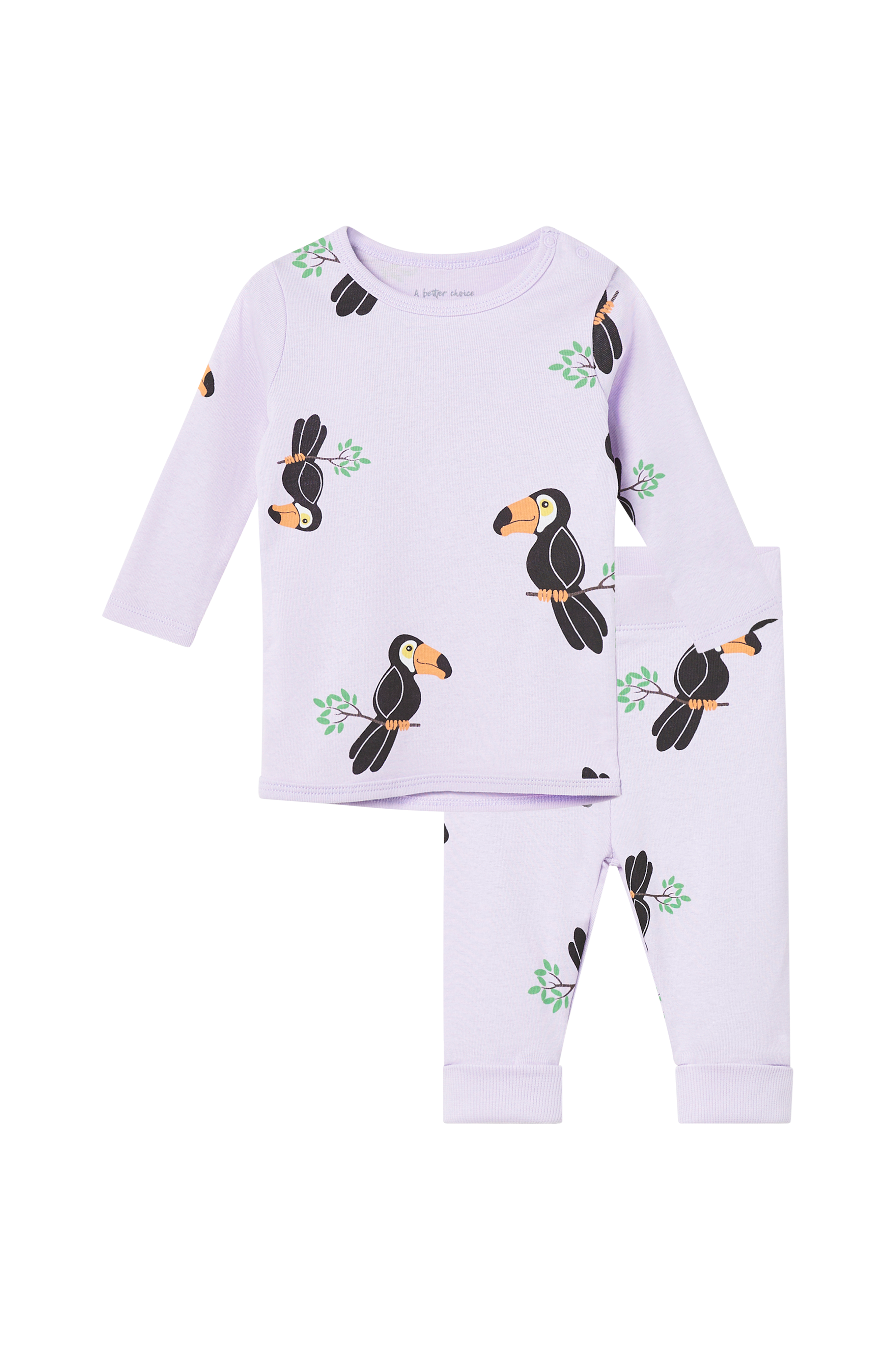 - Todelt sæt i bomuldsjersey - Langærmet top med trykknapper på den ene skulder - Trykknapper på skulderen og i skridtet - Bukser med elastiktalje og ribkant i benkanten - Produktet indeholder økologisk bomuld, som er dyrket uden kemiske sprøjtemidler, kunstgødning og genmodificerede afgrøder (GMO). Dette betyder et sundere arbejdsmiljø for landmænd og bedre jord.