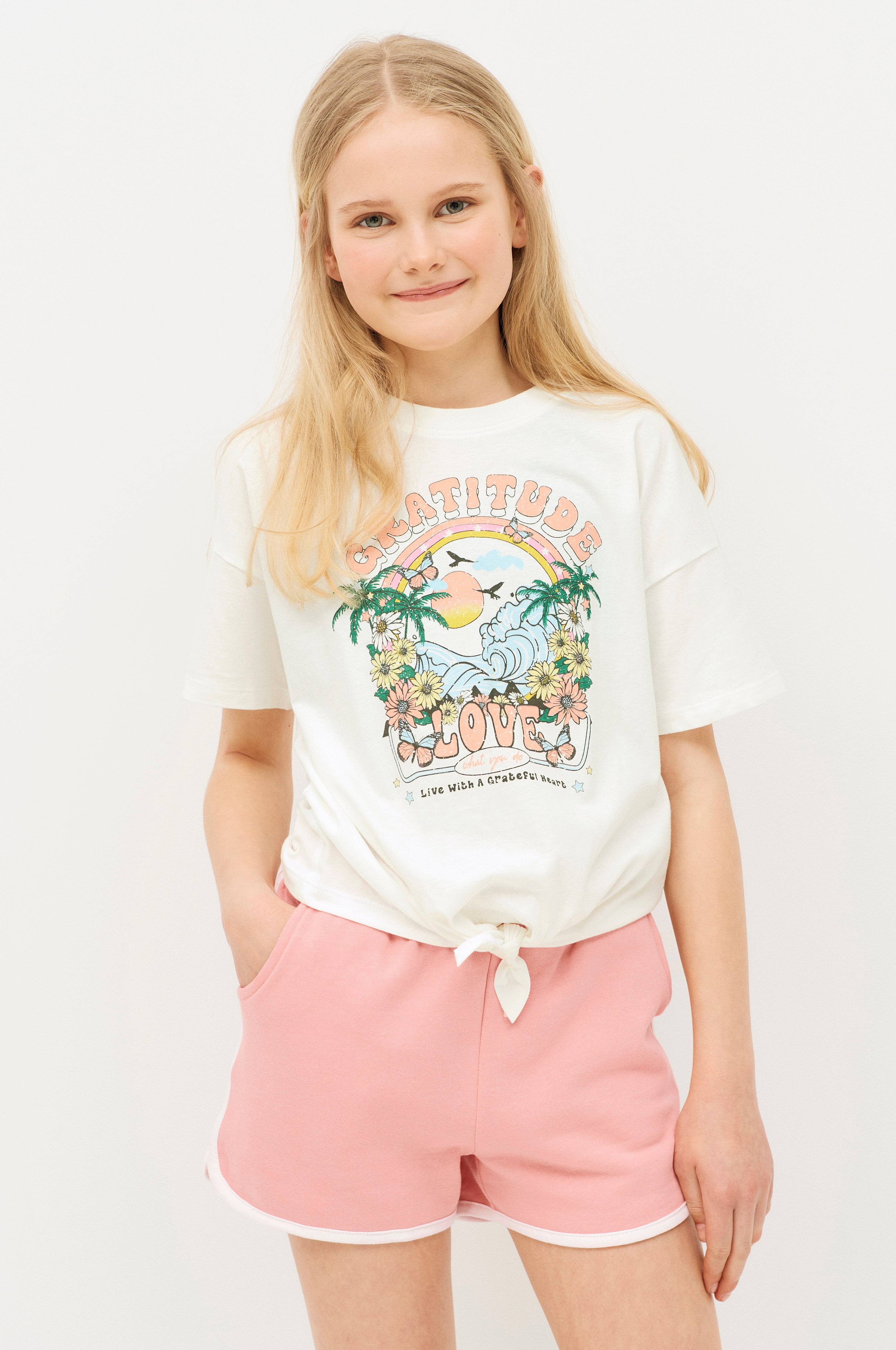 2-delt sæt af bomuld med kortærmet top og sweatshorts. Toppen har rund halsudskæring, kort ærme og en dekorativ bindedetalje forneden foran. Shortsene har elastisk talje med løbegang og to lommer.