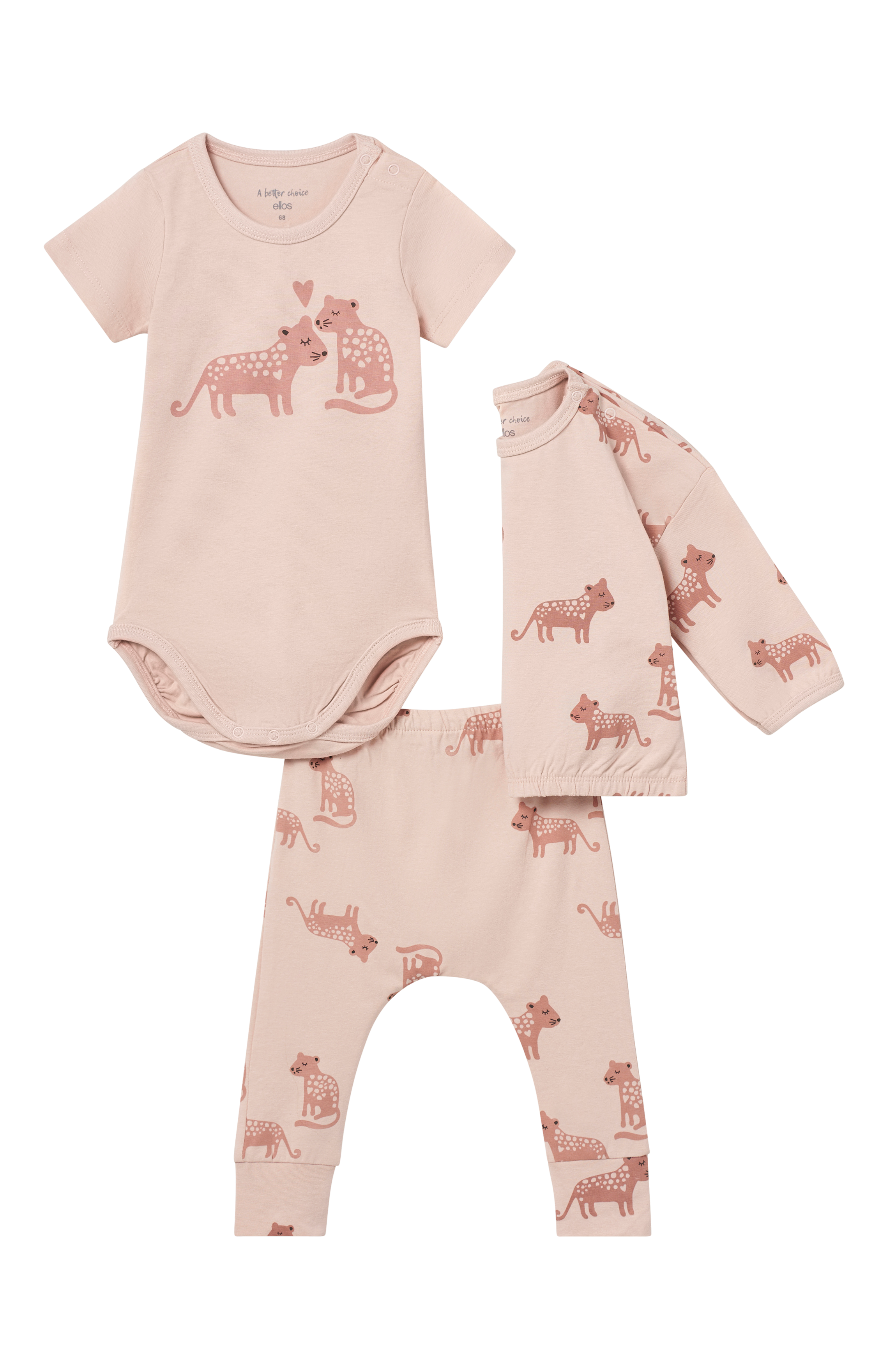Sæt i tre dele i mønstret bomuldsjersey. 1 par leggings med elastisk talje 1 kortærmet body med trykknapper på den ene skulder og i skridtet 1 langærmet top med trykknapper på den ene skulder og elastik i kanten forneden