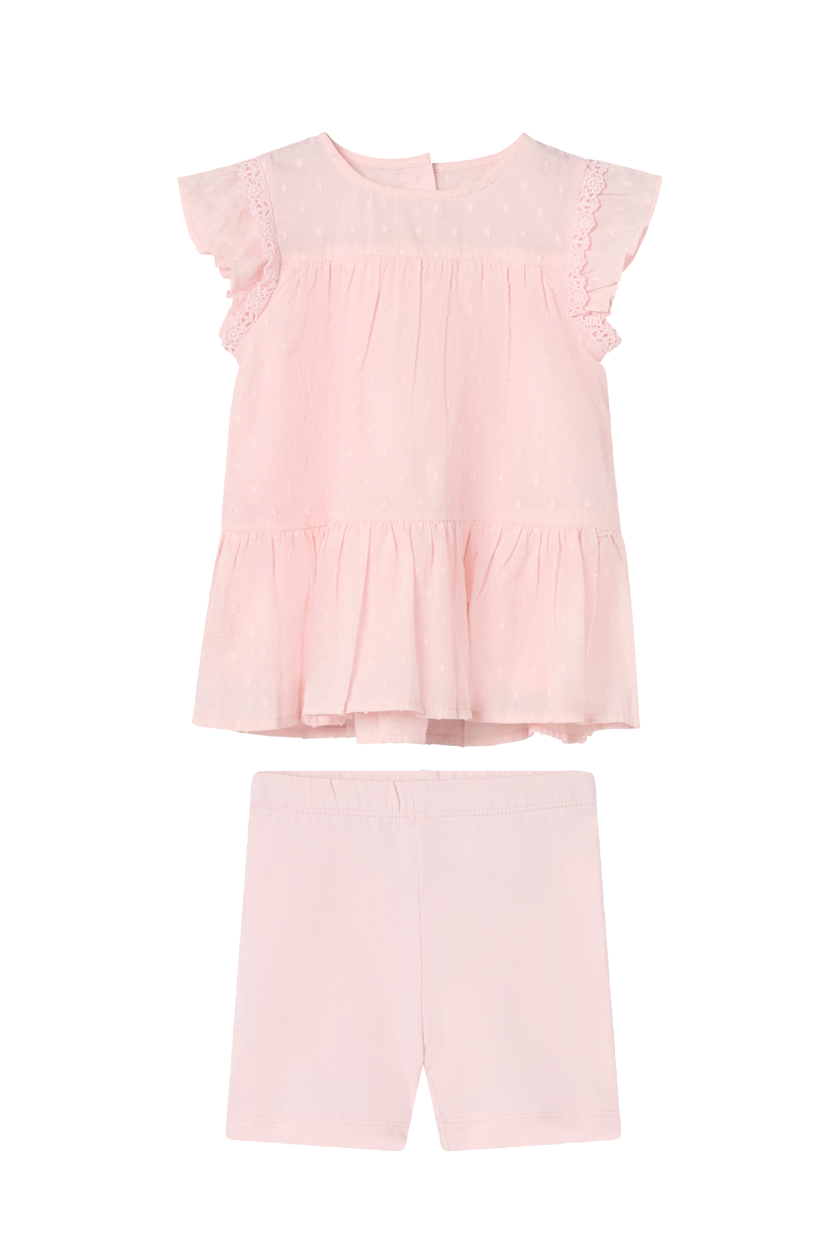 • Vævet top med strukturprikker• Rund hals med knapper i nakken• Vingeærme med blondekant• For• Elastiske leggings med korte ben og elastik ved taljen