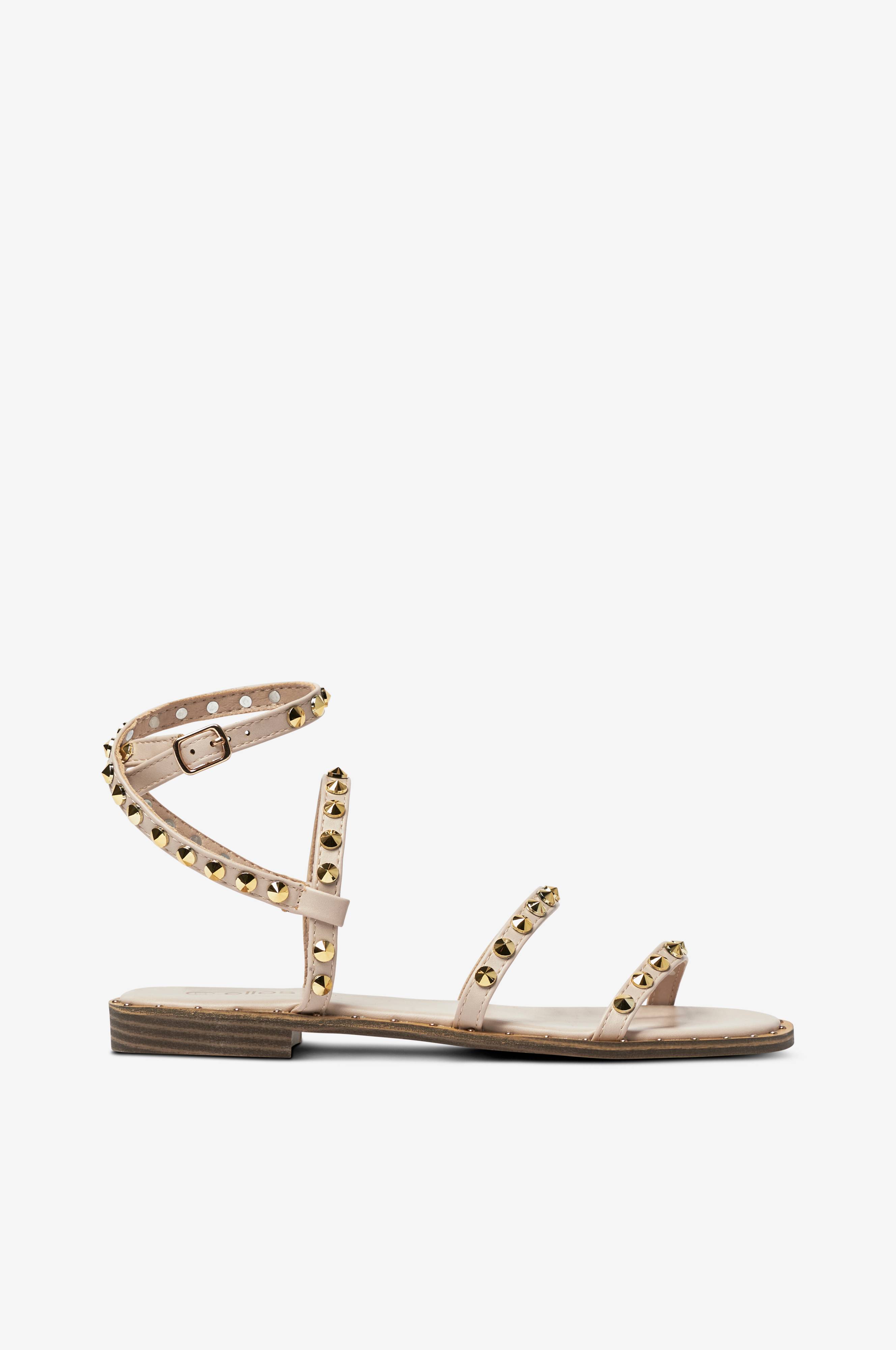 • Flad sål med lille hæl• Flere remme i imiteret læder med guldfarvede nitter• Spænde i siden