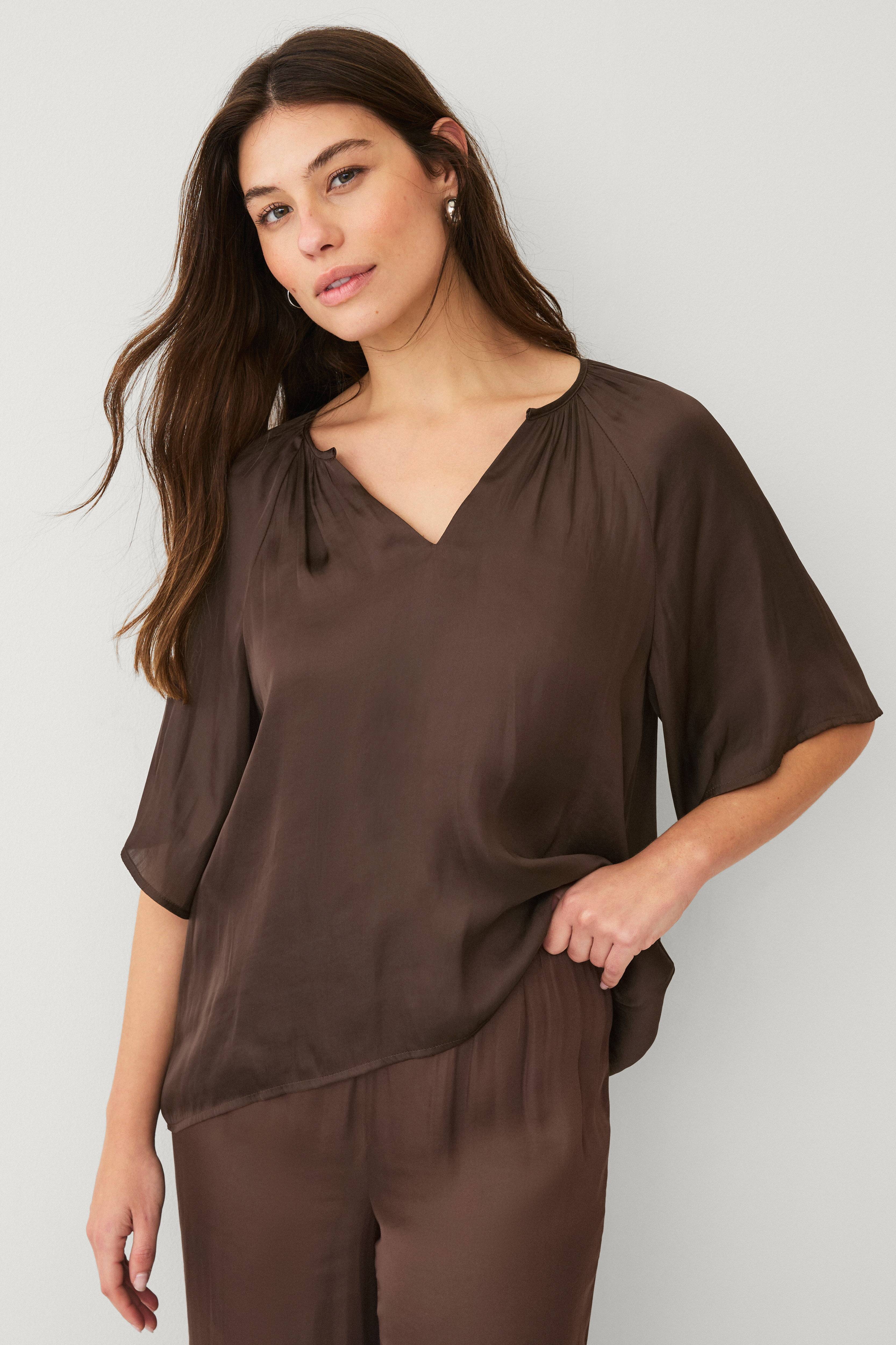 • Store størrelser• V-udskæring• Brede, halvlange ærmer• Tynd kvalitet med glans• Længde: 62 cm i størrelse 34/36