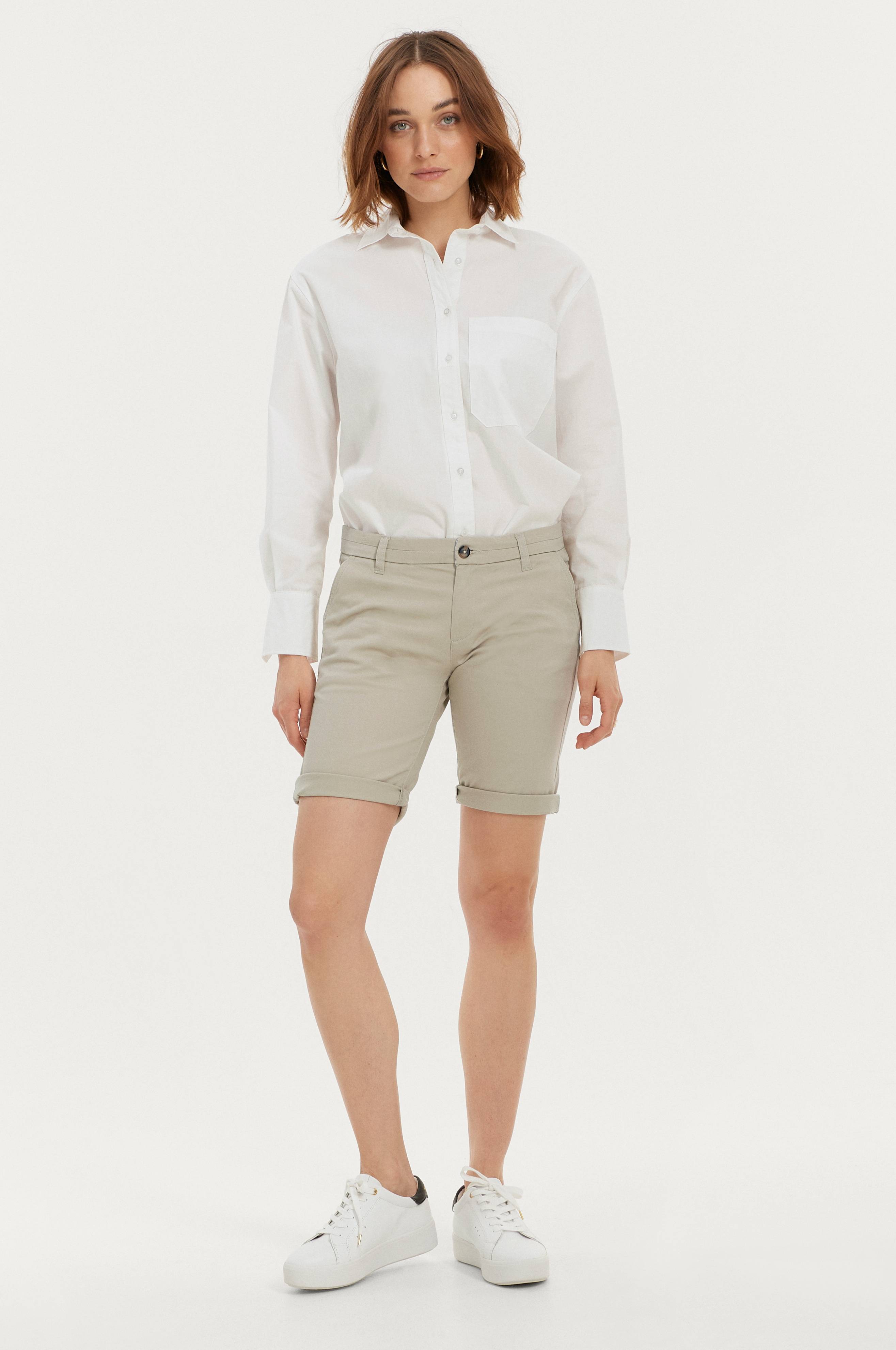 Shorts Amelie i vævet stretchkvalitet med normalhøj talje, normal pasform og lidt hængende skridt. Linning med bæltestropper, knap og gylp med lynlås. Lommer i siden og to paspolerede lommer bagpå. Benlængde ca. 28 cm i str. 38.