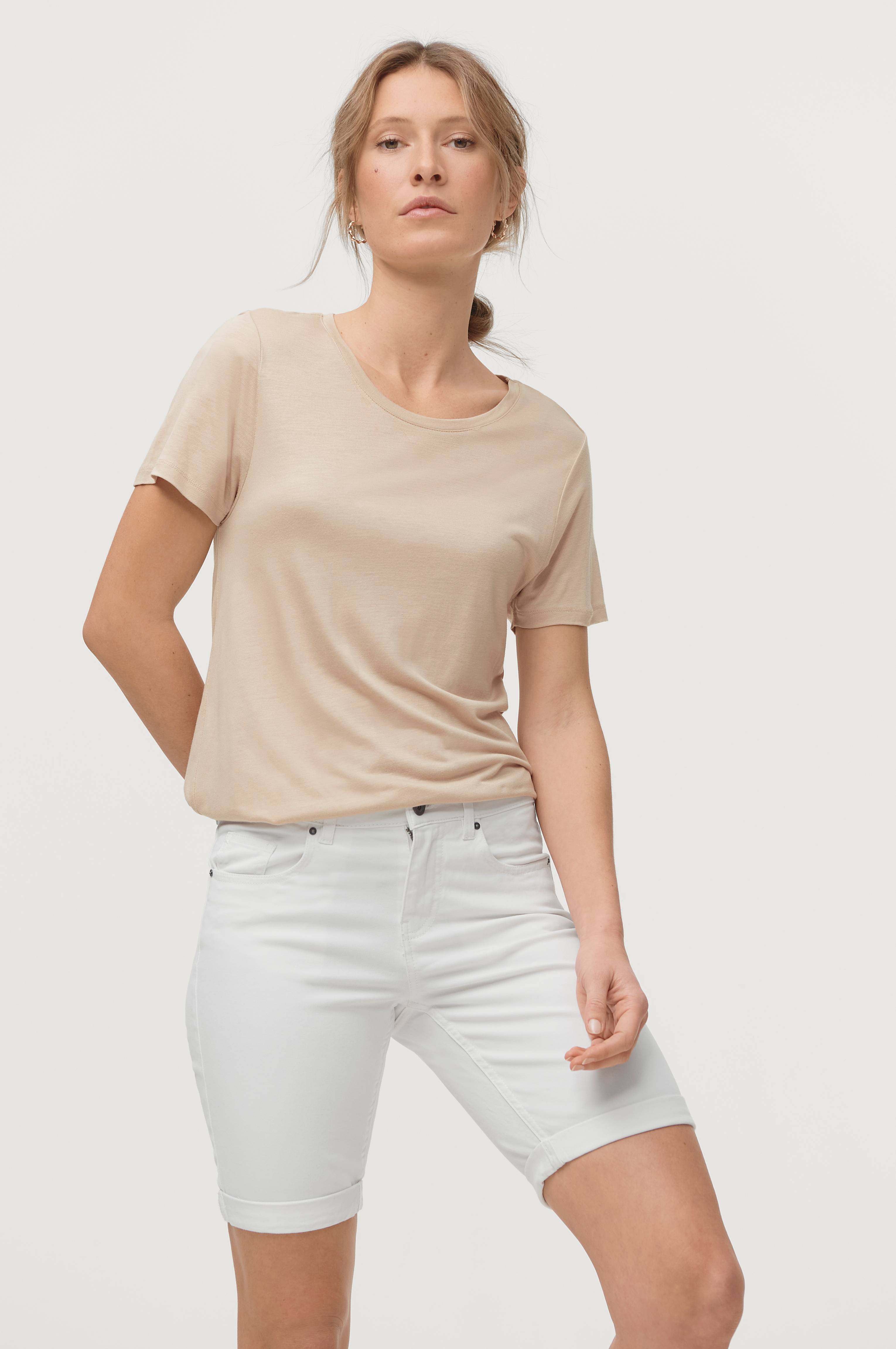 Shorts Celine i vævet bomuldskvalitet med stretch. 5-lommemodel med normalhøj talje, smal pasform og smalle ben. Nittedekorationer på lommerne foran. Linning med bæltestropper, knap og gylp med lynlås. Benlængde ca. 24 cm i str. 38.