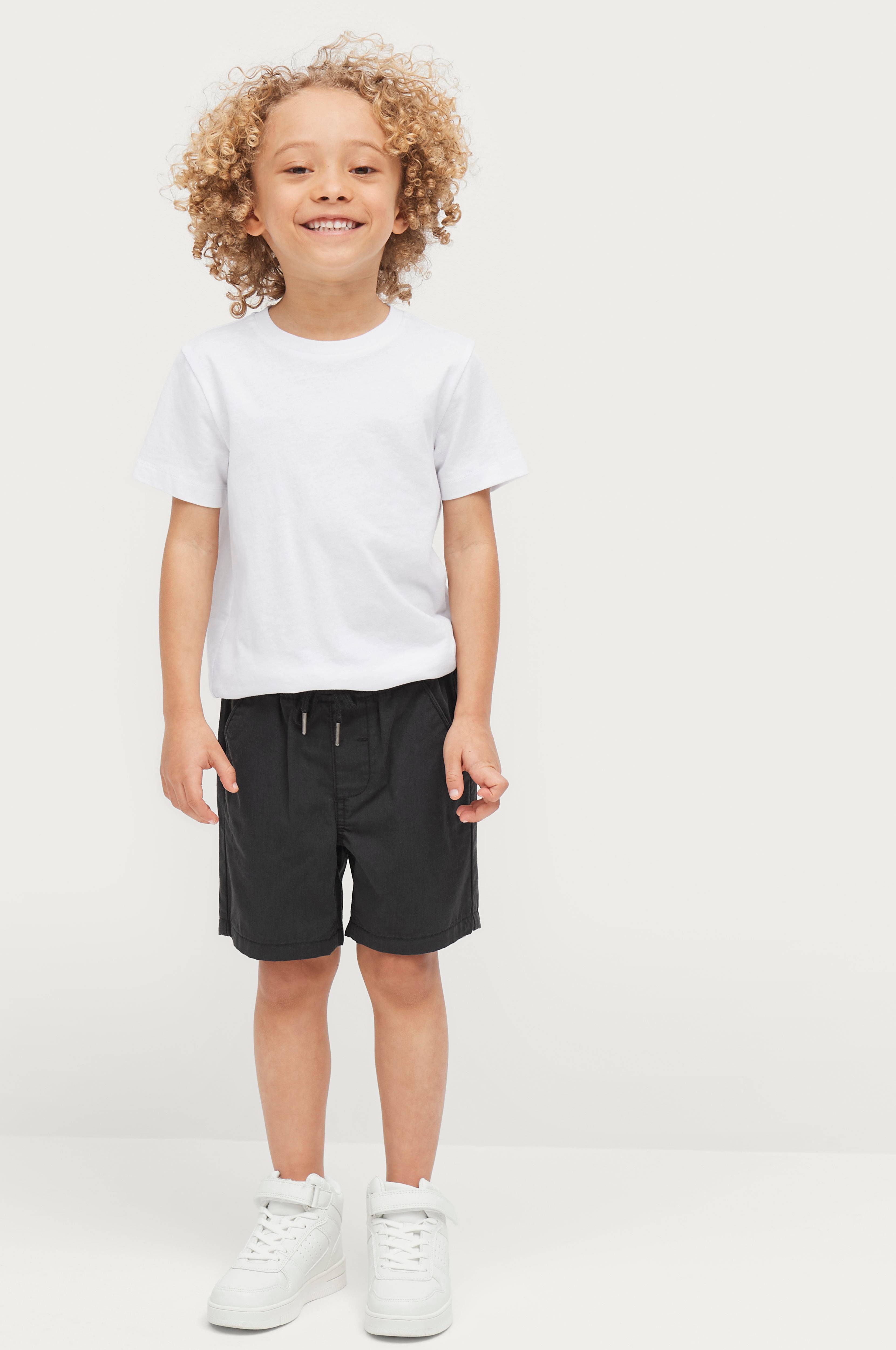 Shorts i vævet, blødvasket kvalitet af bomuld. Elastisk linning med løbegang. To lommer for og to lommer bag.