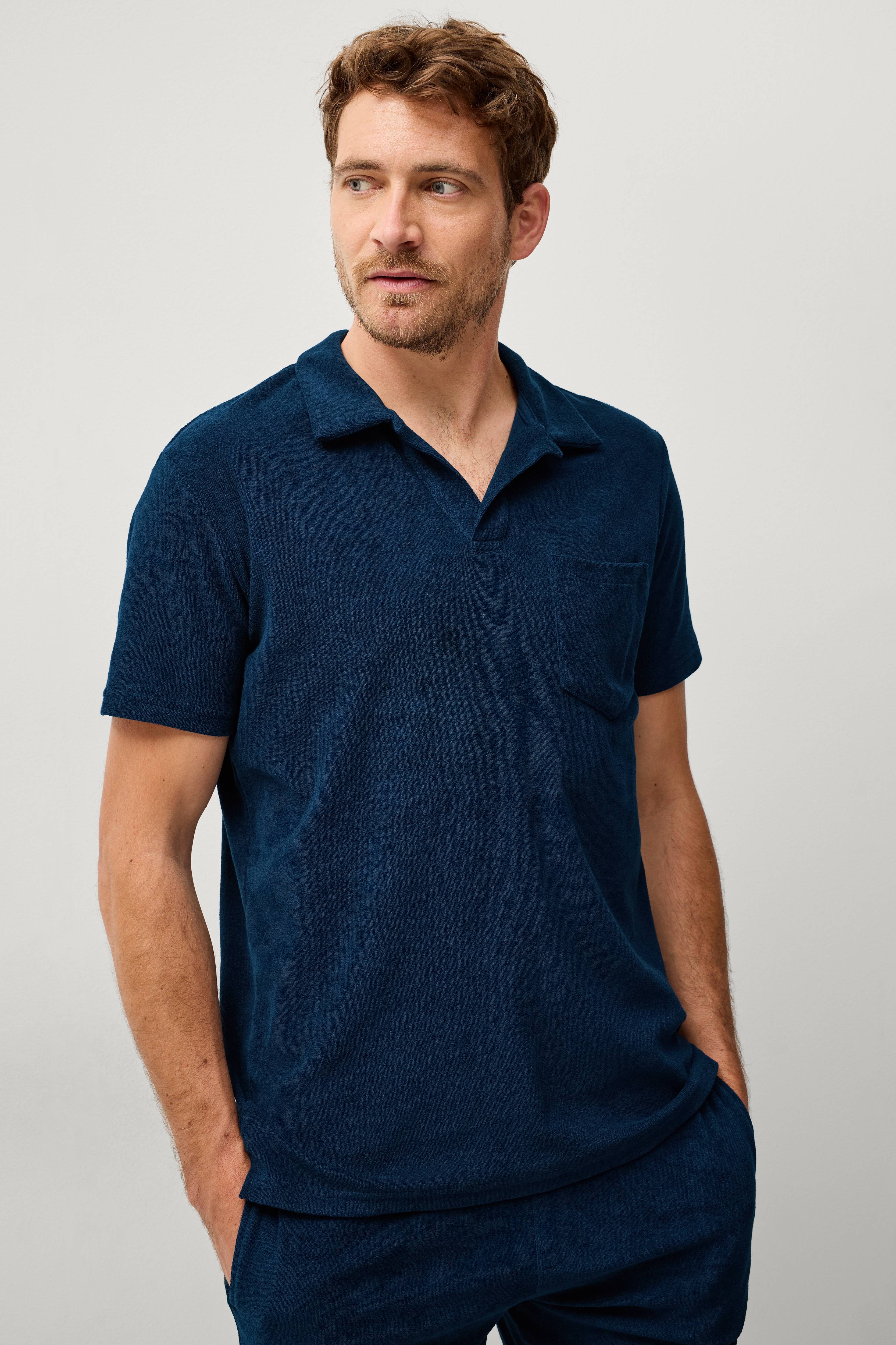 • Kortærmet skjorte i blødt frottémateriale• V-formet halsudskæring• Brystlomme