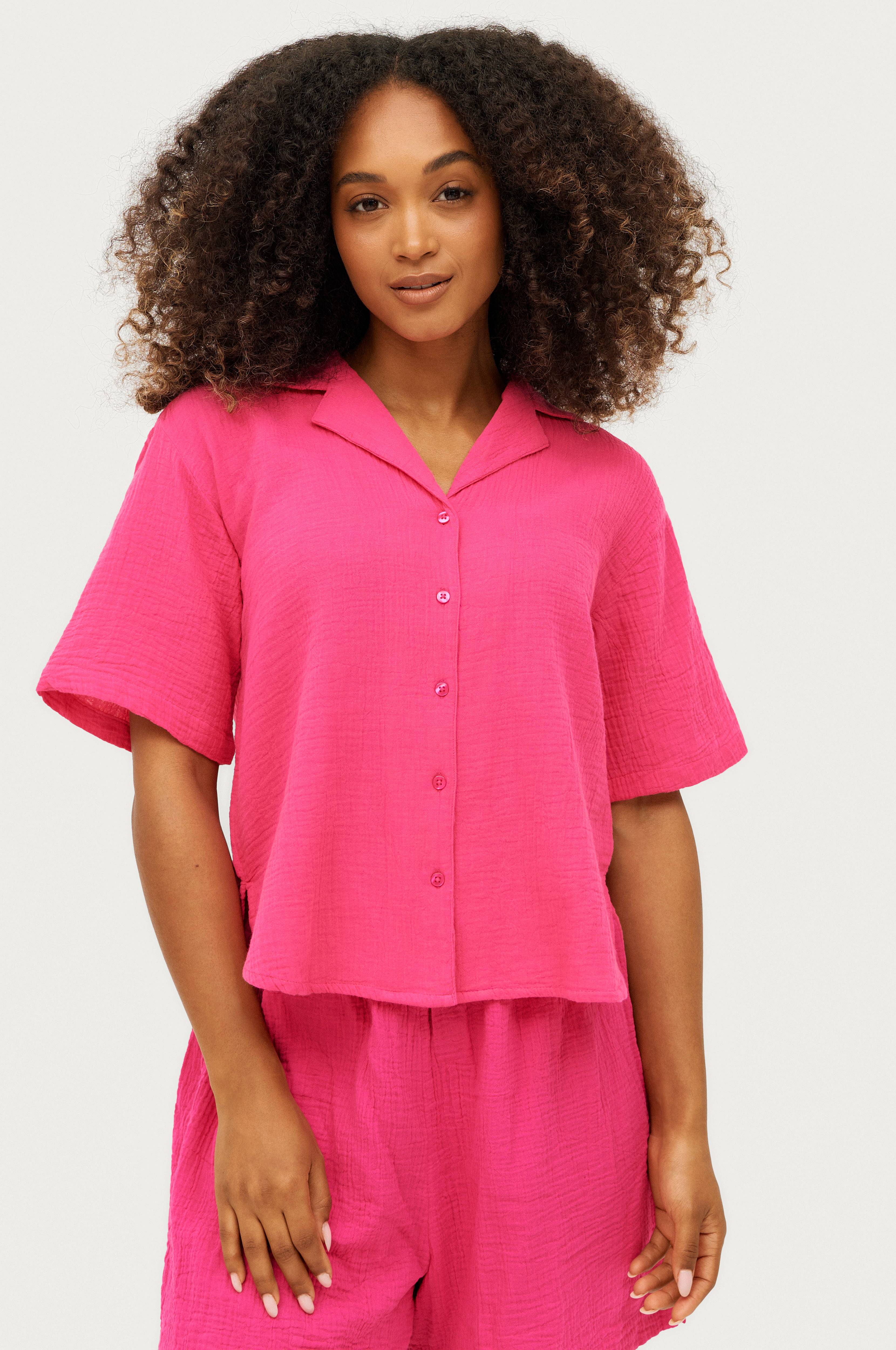 Vævet bluse i let og luftig bomuldsmusselin med struktur i stoffet. Krave med revers. Knapper foran. Længde ca. 58 cm i str. 34/36.