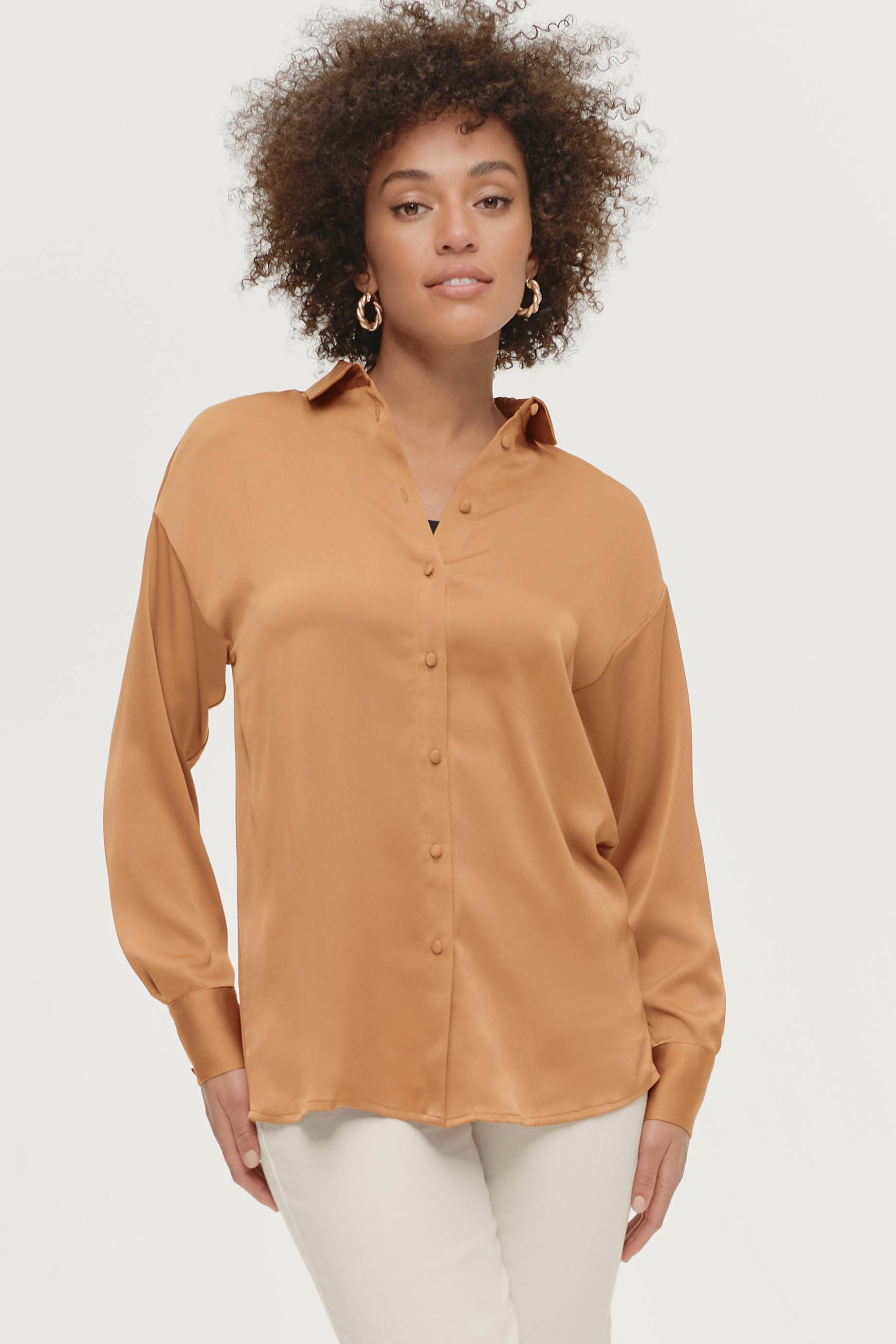 Skjorte Livia, stilren, klassisk model med en løsere oversize-pasform. Betrukne knapper foran, modgående læg i ryggen og brede manchetter med knapper i ærmekant. I vævet satin med glans og crepet struktur. Længde ca. 71 cm i str. 34/36.