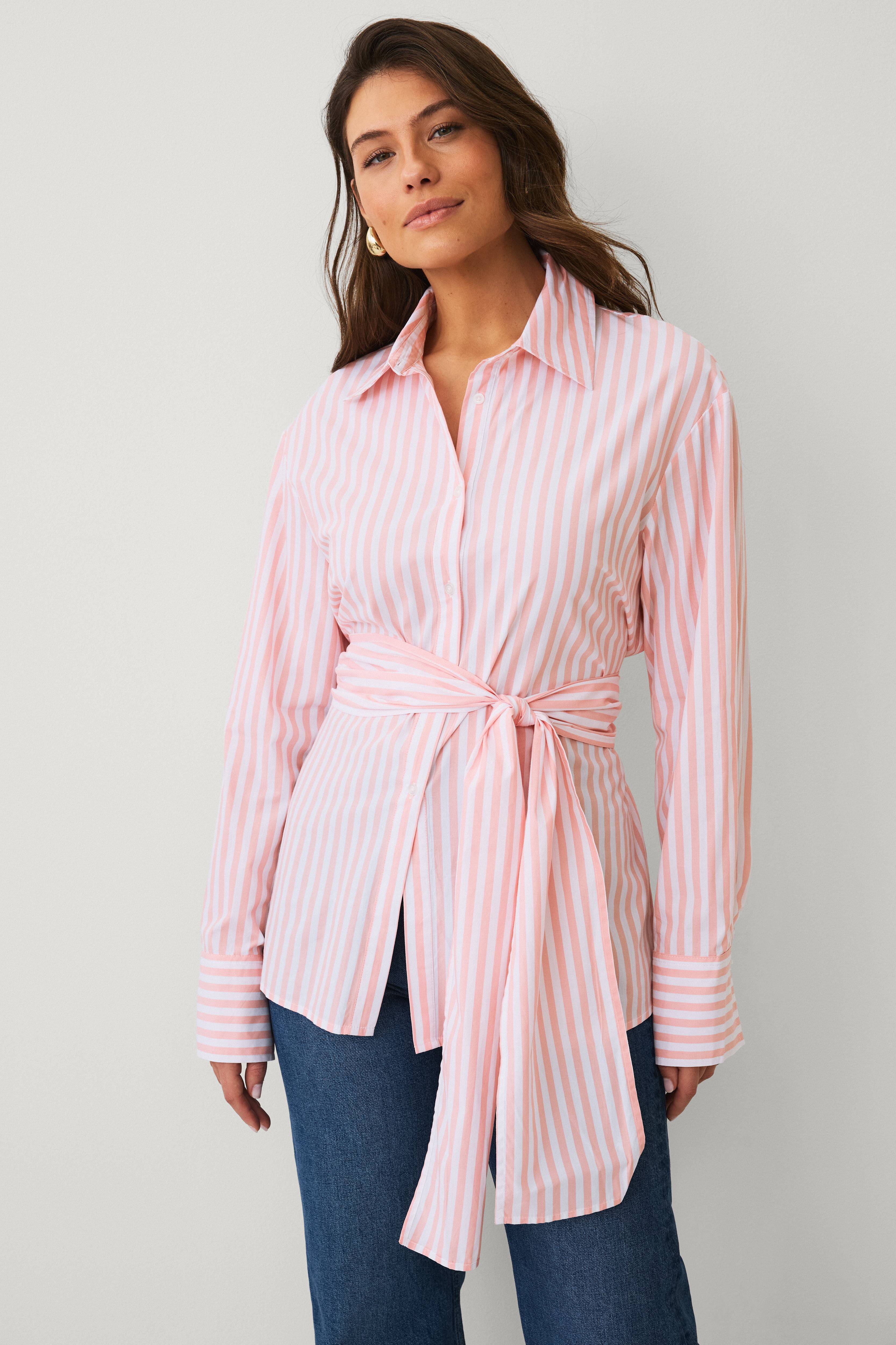 • Tynd, stribet skjorte i bomuldsblanding• Klassisk skjortekrave• Knapstolpe foran• Bindebånd ved taljen• Brede manchetter med en knap• Let afrundet søm• Længde: 72 cm i størrelse S
