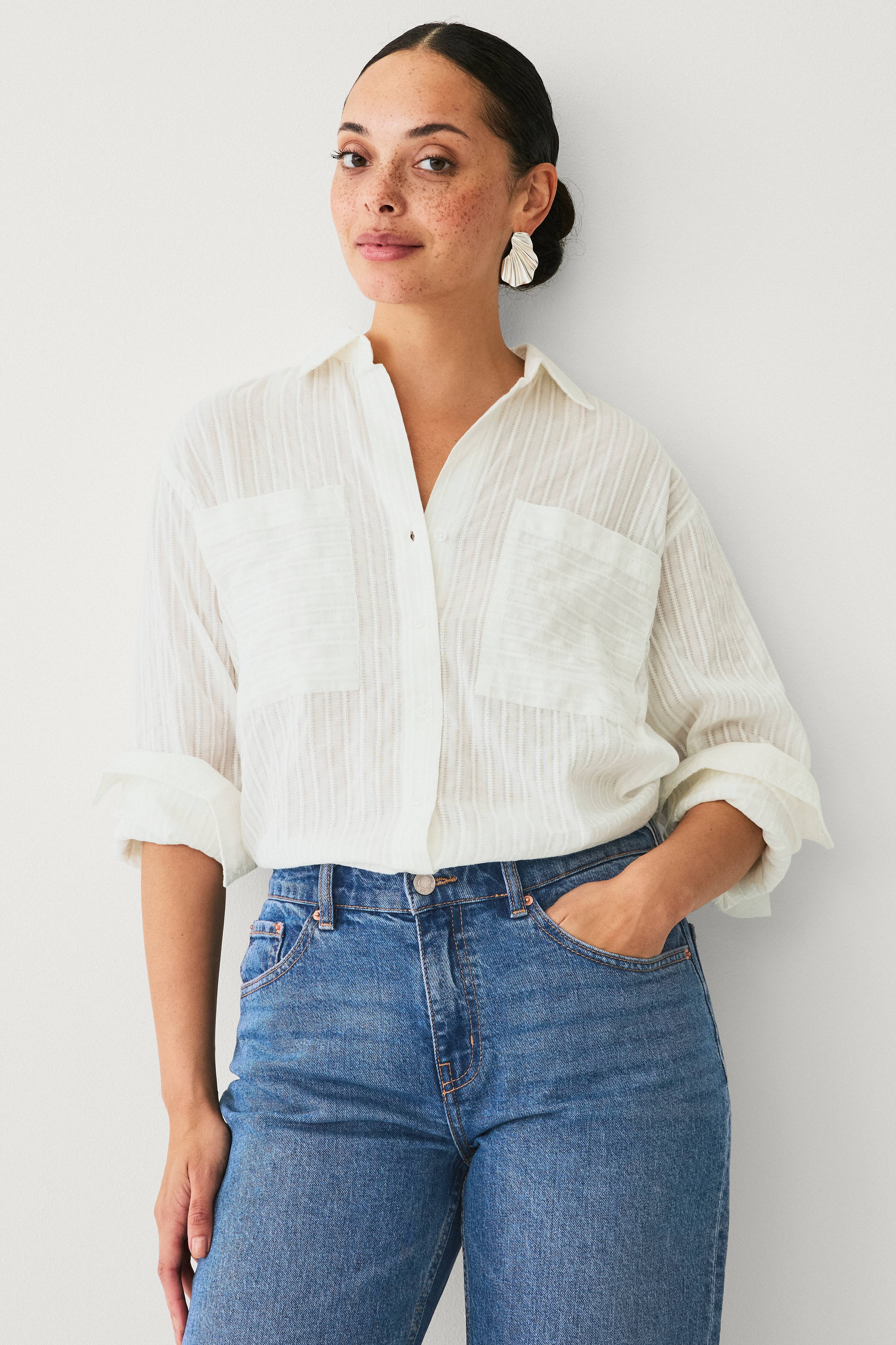 • Dobby-vævet skjorte i bomuld med broderede striber• Oversize model• To brystlommer• Manchet med to knapper• Længere bagside med afrundet søm• Længde: 80 cm i størrelse S