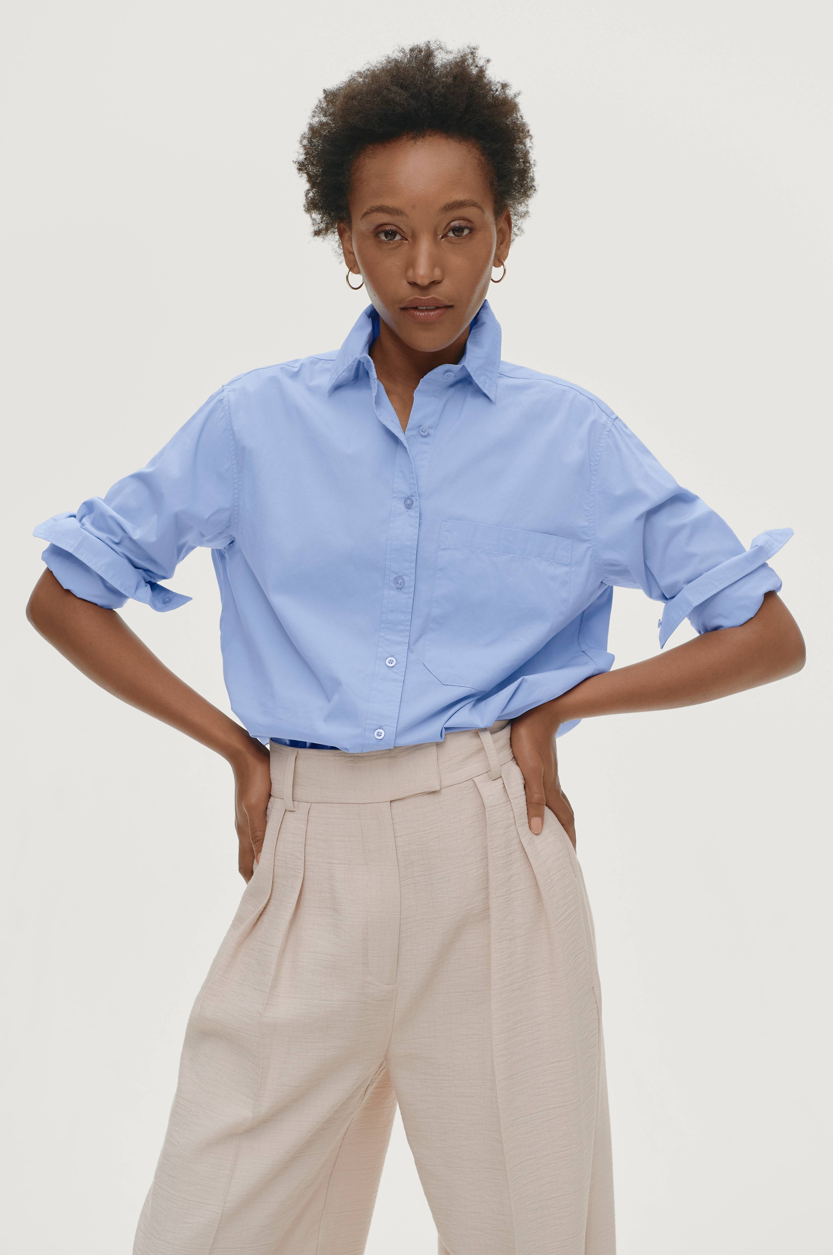 Skjorte Mona i længere, løs model med oversize-pasform. Knapper foran og en stor brystlomme. Manchet i ærmekanten og lagte læg i ryggen. Afrundet kant forneden som er noget længere bagpå. Længde foran ca. 76 cm i str. 34/36.