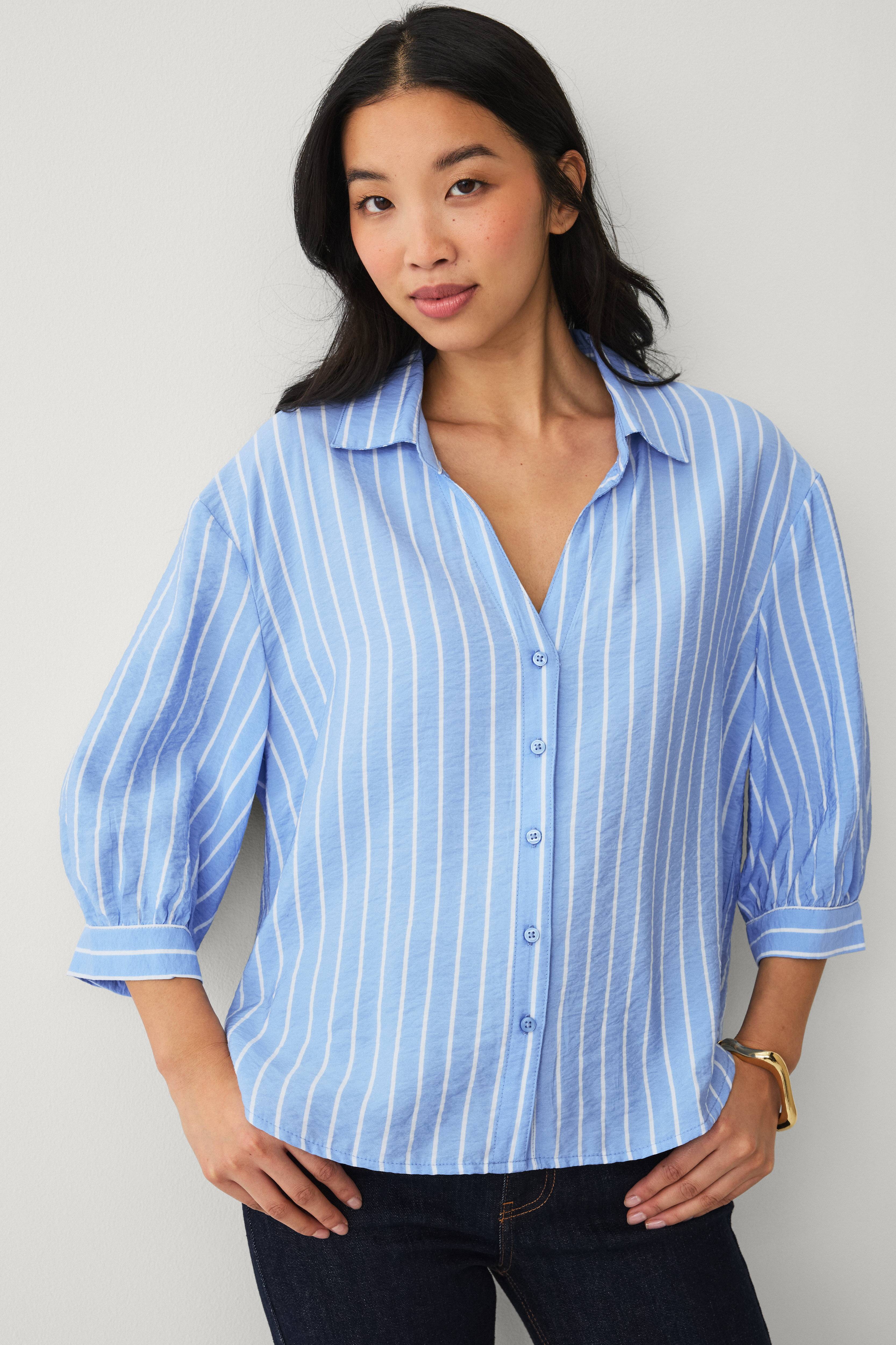 • Skjortebluse i viskoseblanding• Krave• V-udskæring• Halvlange ærmer med bølgeformede detaljer• Slids med knap ved manchetterne• Knaplukning• Afrundet søm• Længde: 62 cm i størrelse S