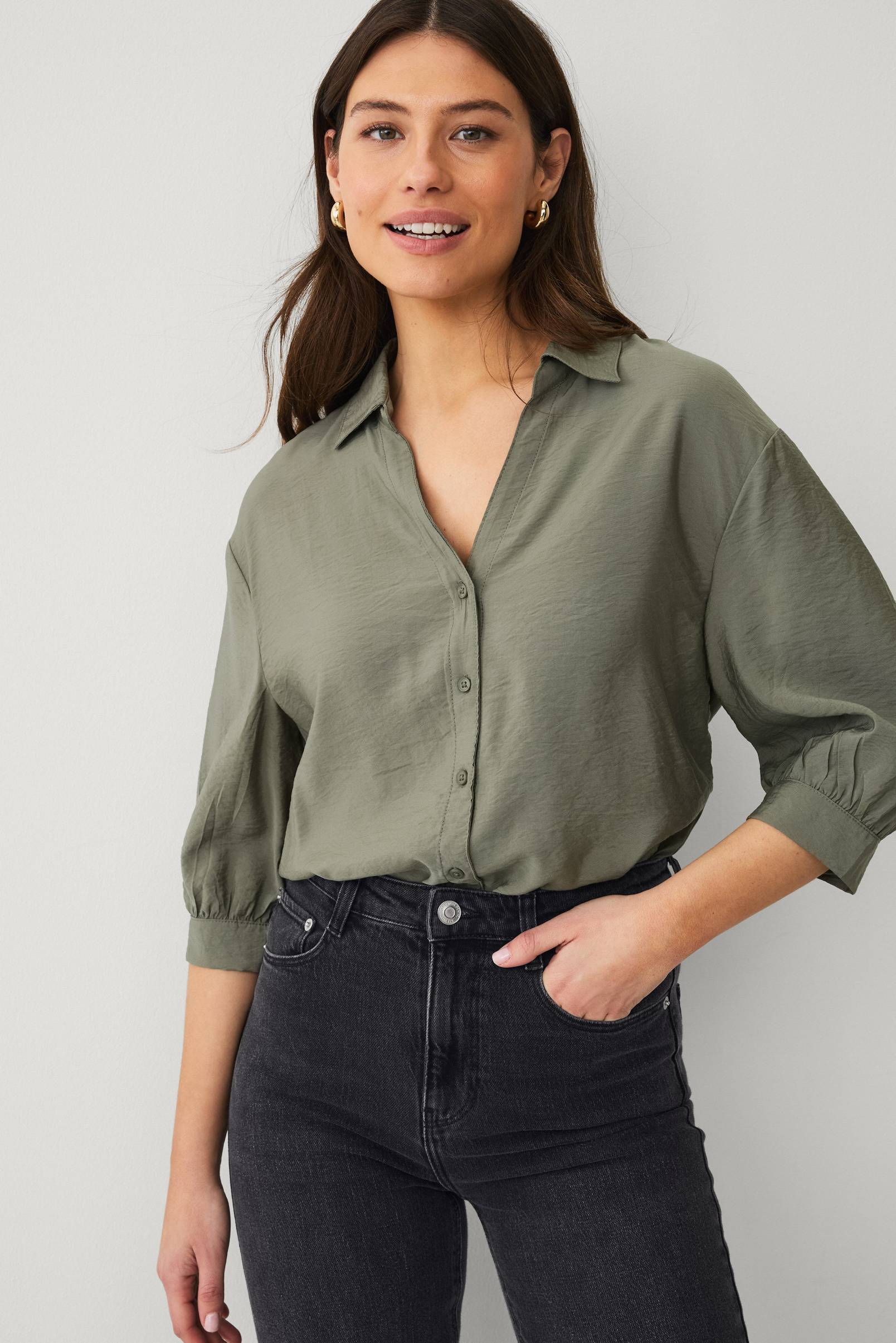 • Skjortebluse i viskoseblanding• Krave• V-udskæring• Halvlange ærmer med bølgeformede detaljer• Slids med knap ved manchetterne• Knaplukning• Afrundet søm• Længde: 62 cm i størrelse S