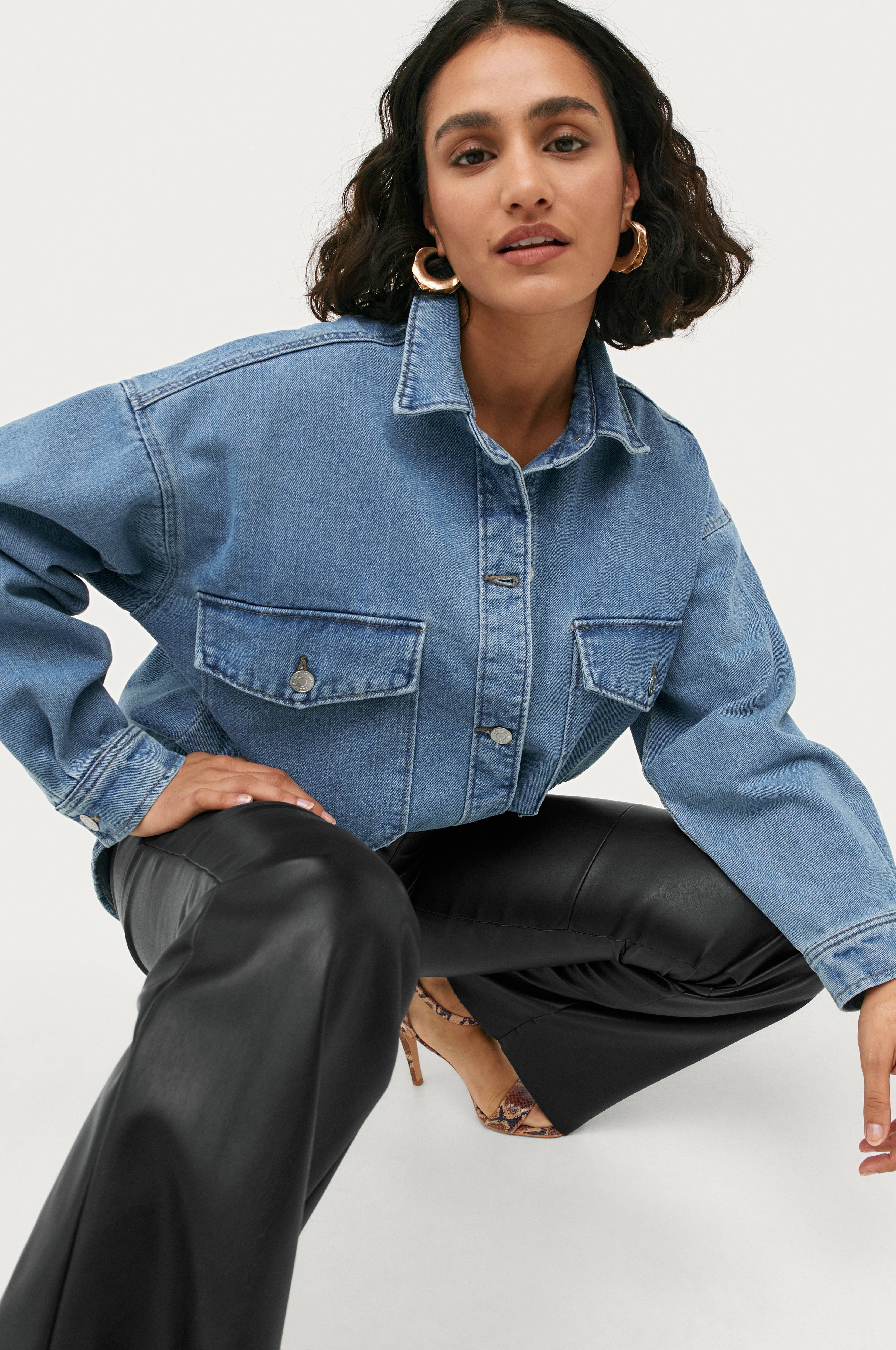 Skjortejakke Hilda i oversizemodel med prægede metalknapper. To brystlommer med klap med knap. En knap i ærmekant og slids i siderne. Længde ca. 75 cm i str. 36/40.