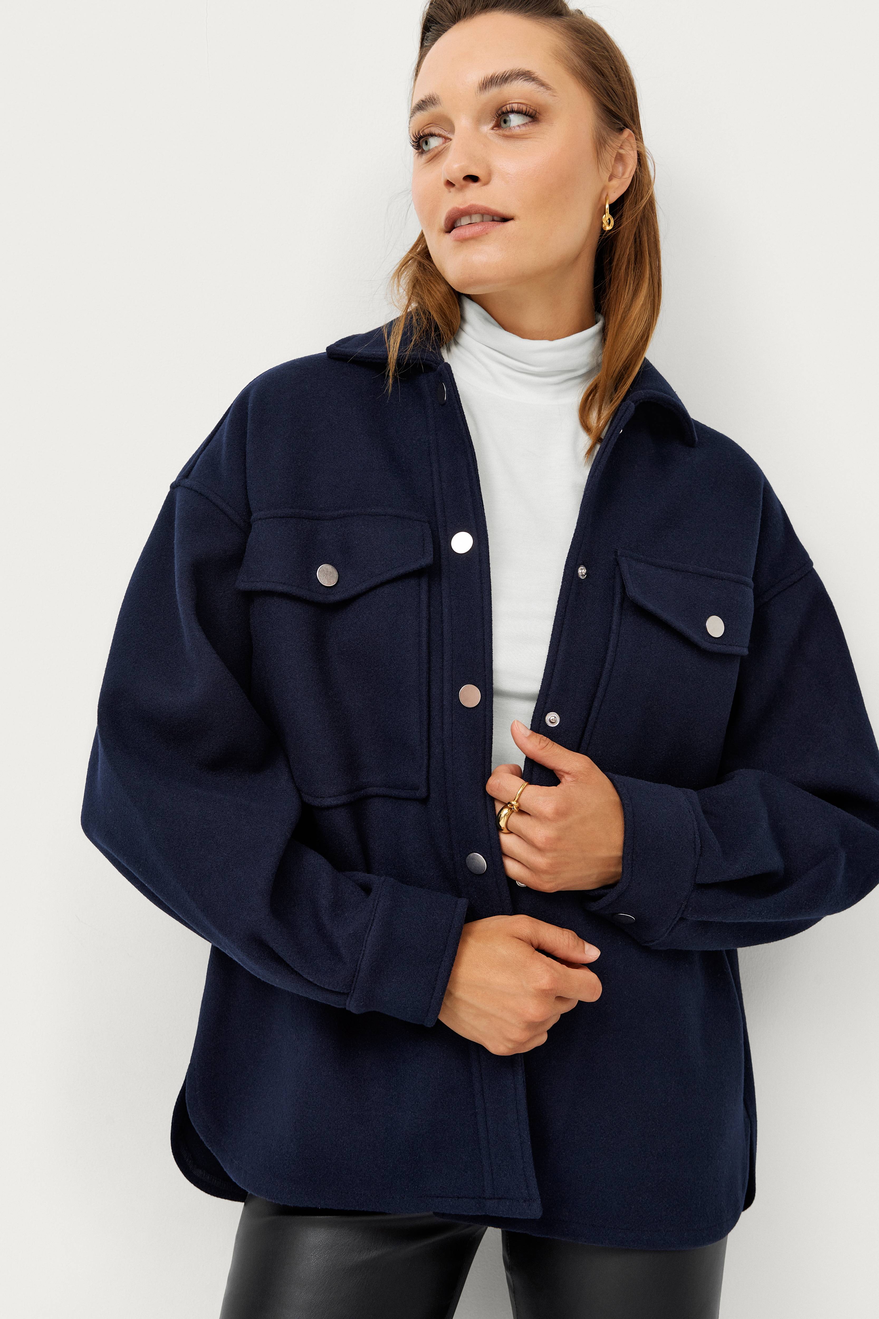 Skjortejakke i oversizemodel med blød, filtet overflade. Lukkes med trykknapper. To brystlommer med klap og trykknap samt trykknap i ærmekant. Slids forneden i siderne. Længde ca. 75 cm i str. 34/36.