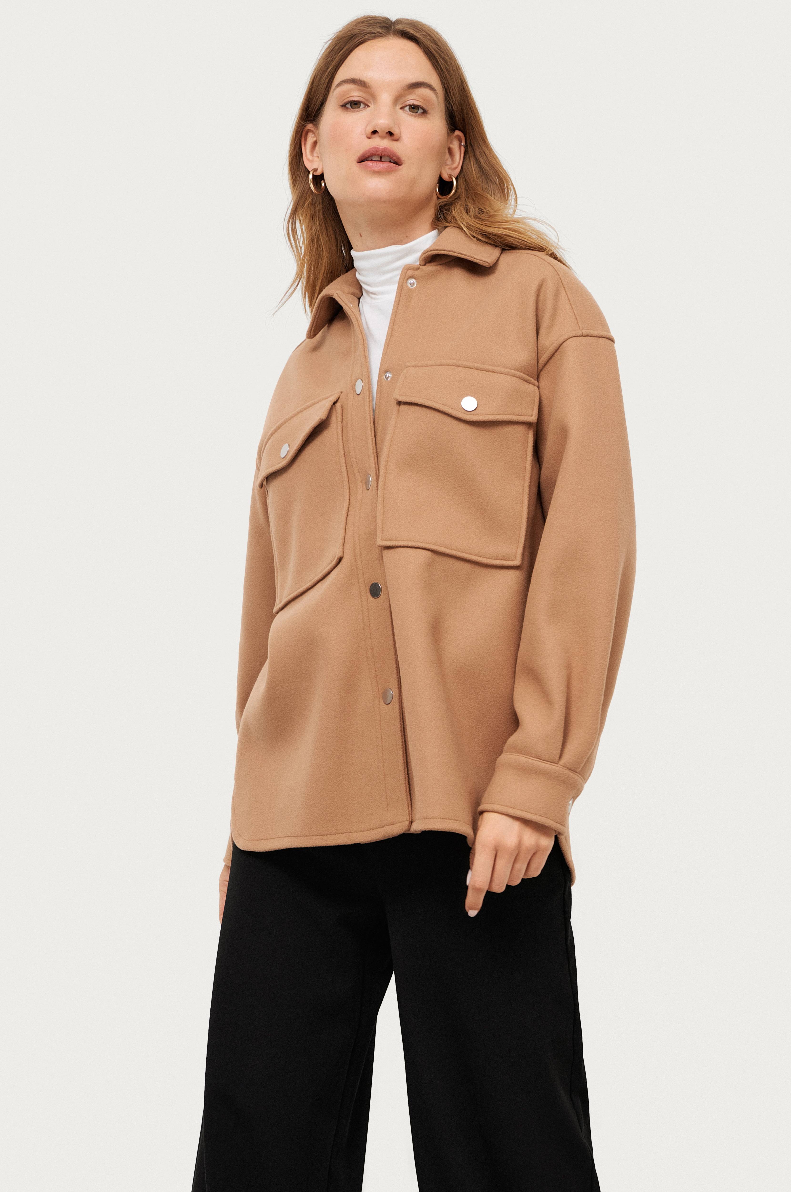 Skjortejakke i oversizemodel med blød, filtet overflade. Lukkes med trykknapper. To brystlommer med klap og trykknap samt trykknap i ærmekant. Slids forneden i siderne. Længde ca. 75 cm i str. 34/36.