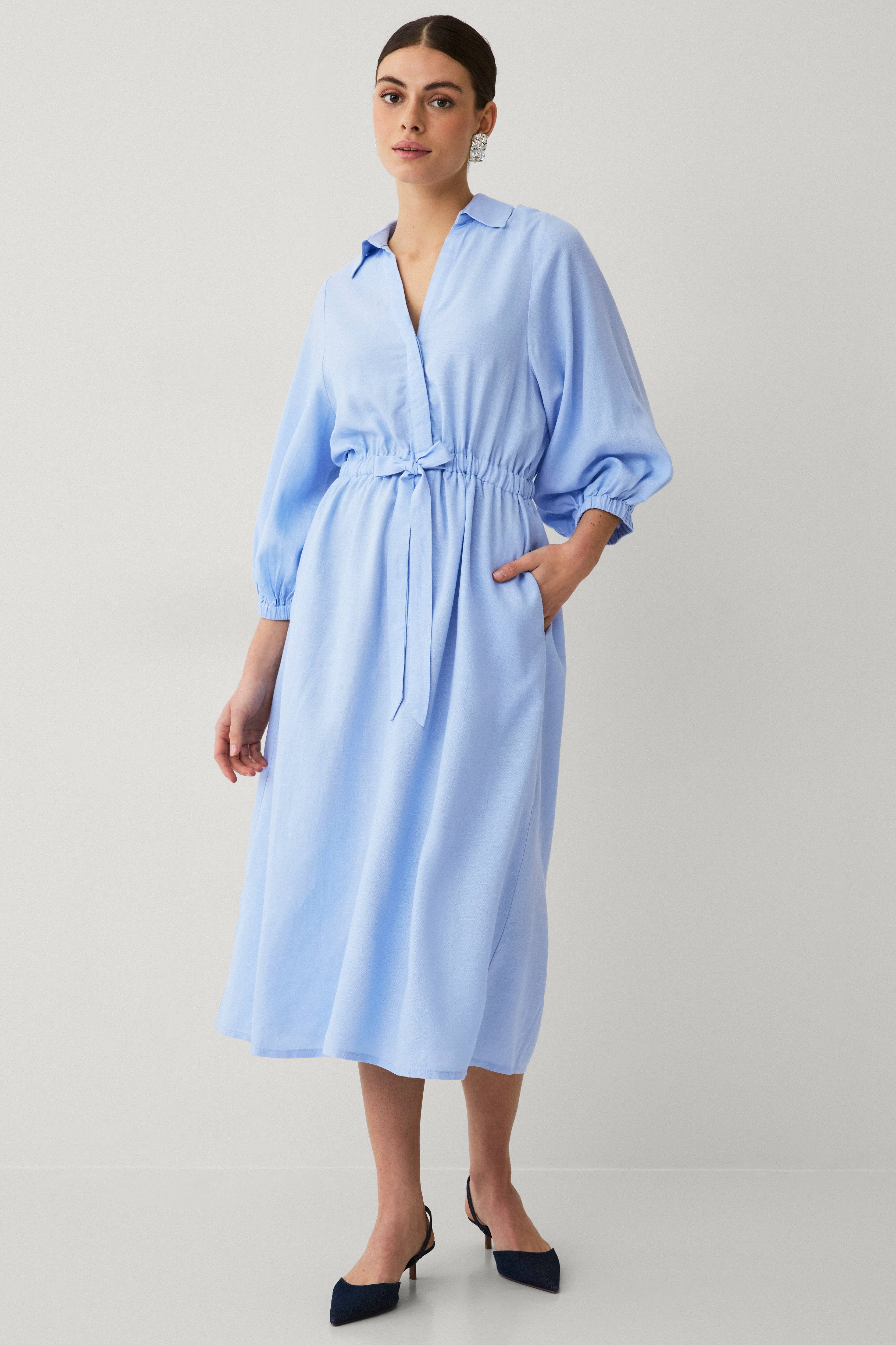 • Skjortekjole i luftig hørblanding• V-formet halsudskæring med skjortekrave og knapstolpe med skjulte knapper• Talje med elastik og træksnørre• Lange ærmer med elastik ved manchetterne• Lommer i siderne• Længde: 126 cm i størrelse S