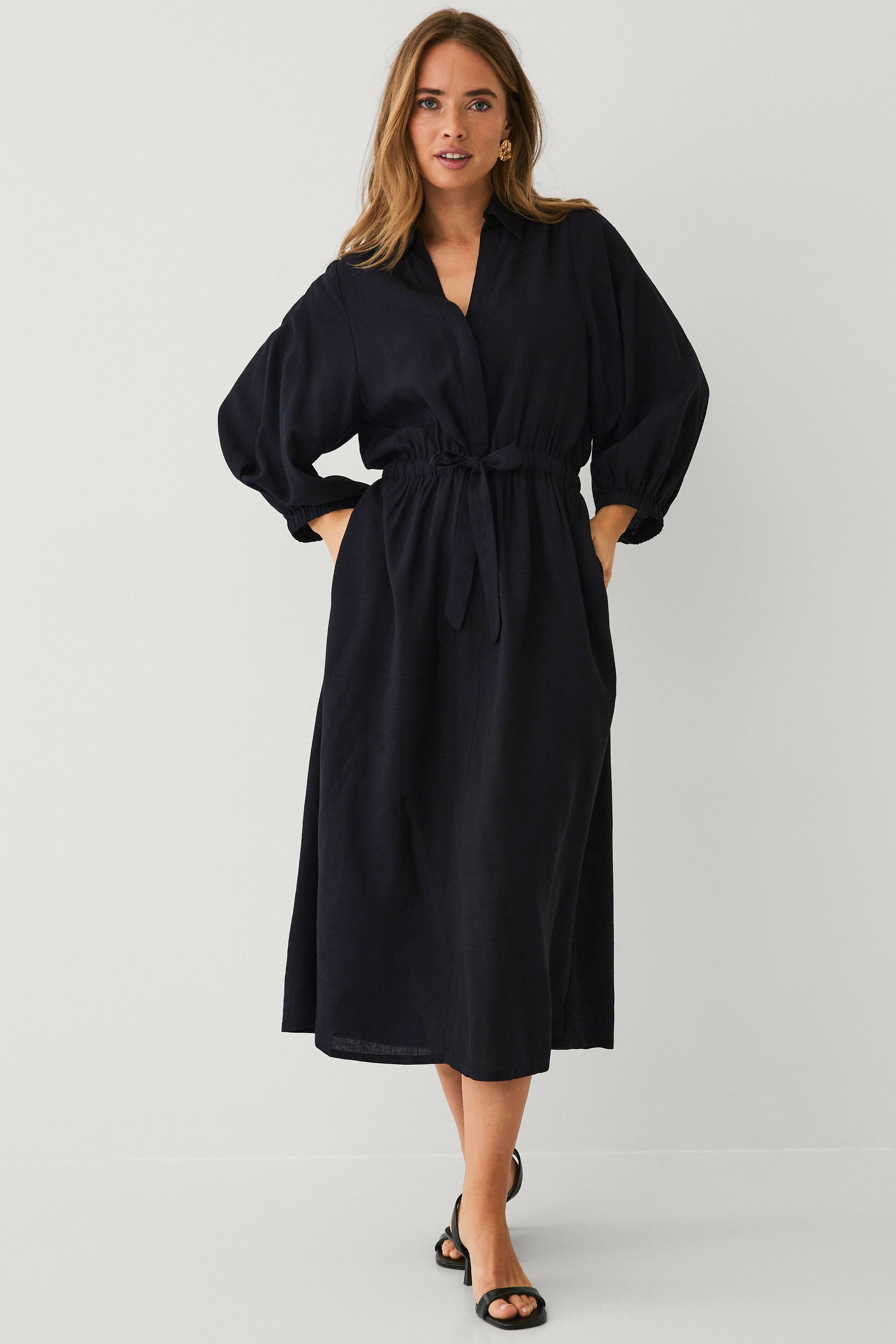 • Skjortekjole i luftig hørblanding• V-formet halsudskæring med skjortekrave og knapstolpe med skjulte knapper• Talje med elastik og træksnørre• Lange ærmer med elastik ved manchetterne• Lommer i siderne• Længde: 126 cm i størrelse S
