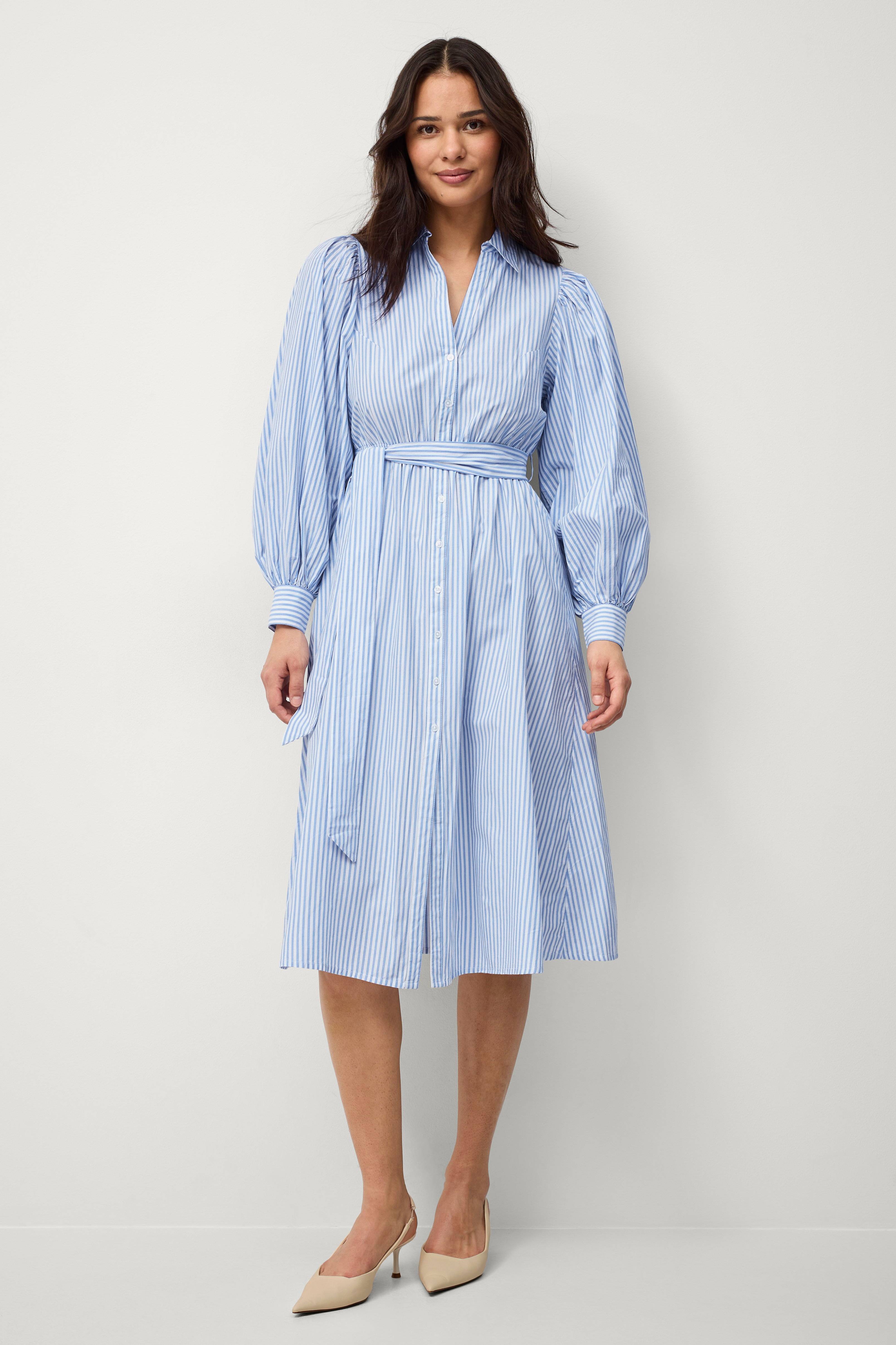 • Store størrelser • Sprød poplin i bomuld • Gennemknappet model med aftageligt bæltespænde ved taljen • Elastisk bånd ved taljen • Ballonærmer med samling på toppen • To knapper ved manchetterne • Længde: 117 cm i størrelse 34/36