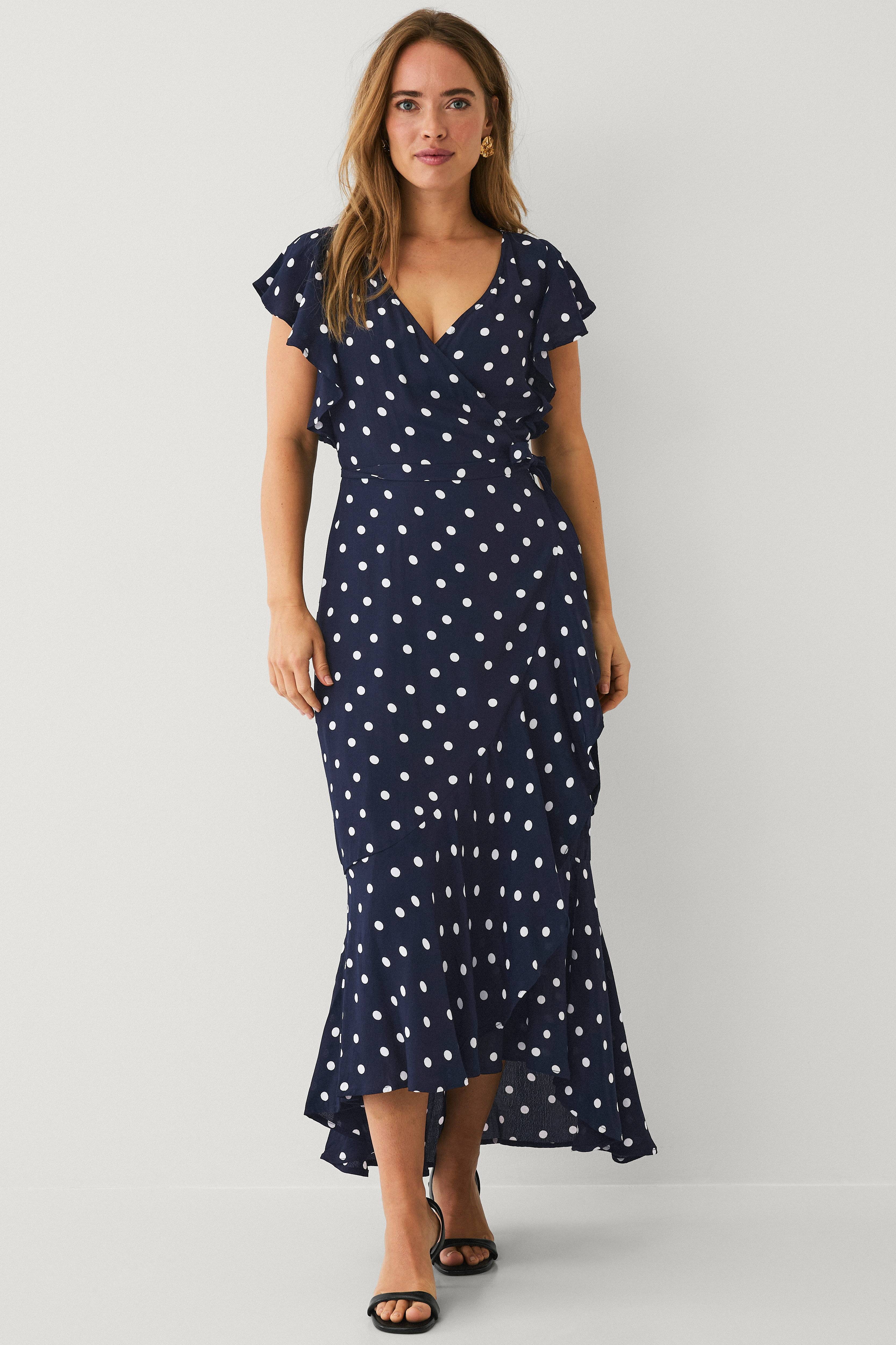• Åben overpaningsmodel med langt bindebånd ved taljen • Kort flagrende ærme • Bred volant på forkant med udviklingen og nederst • Længde: 136 cm i størrelse 36