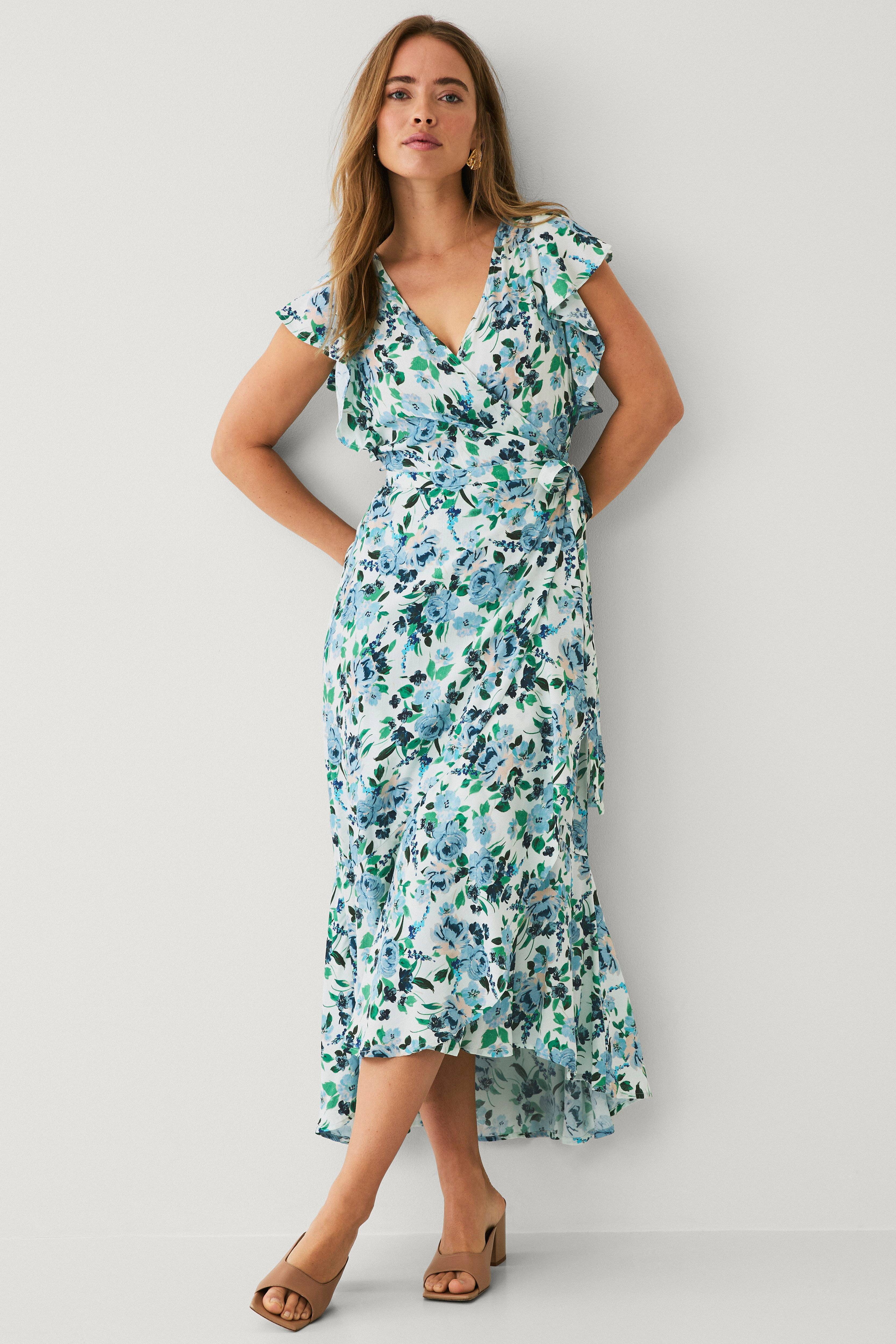 • Åben overpaningsmodel med langt bindebånd ved taljen • Kort flagrende ærme • Bred volant på forkant med udviklingen og nederst • Længde: 136 cm i størrelse 36