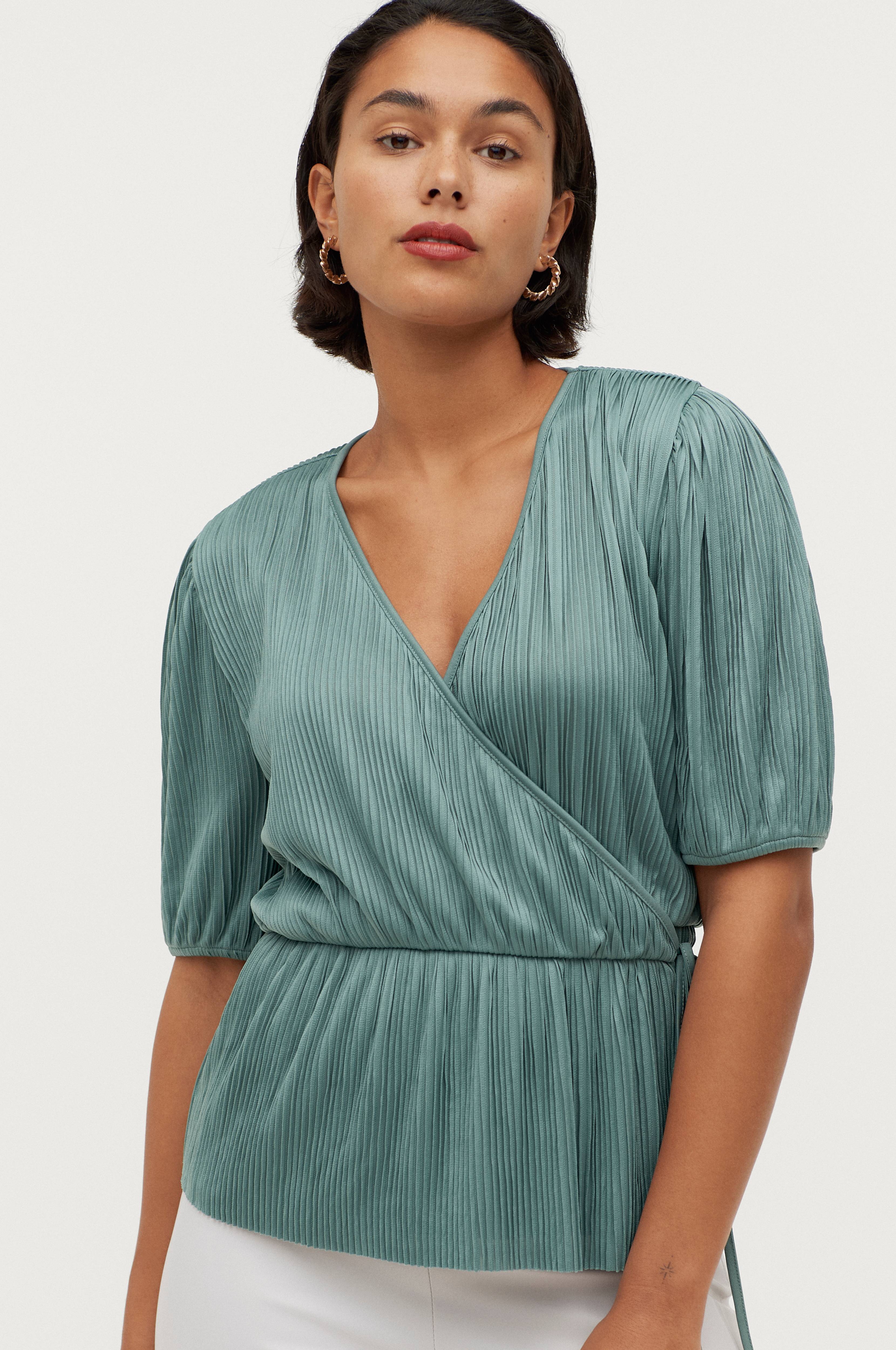 • Slå-om design• Halvlange ærmer• Bindebånd ved taljen• Plisseret stof med glans• Længde: 60 cm i størrelse 34/36