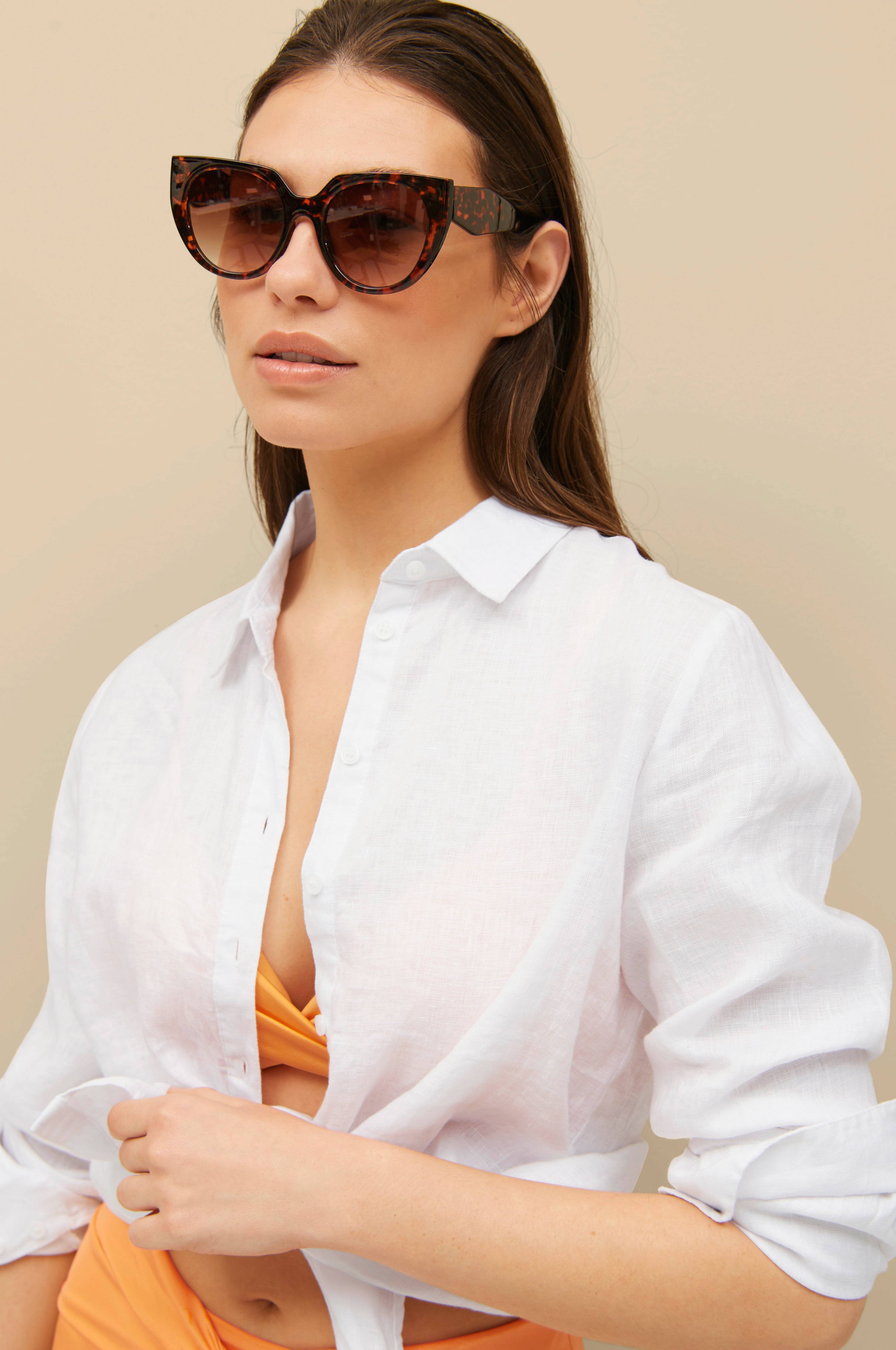 Solbriller med både afrundede og kantede former. Brede stænger og tonet plastglas. Leveres med etui.