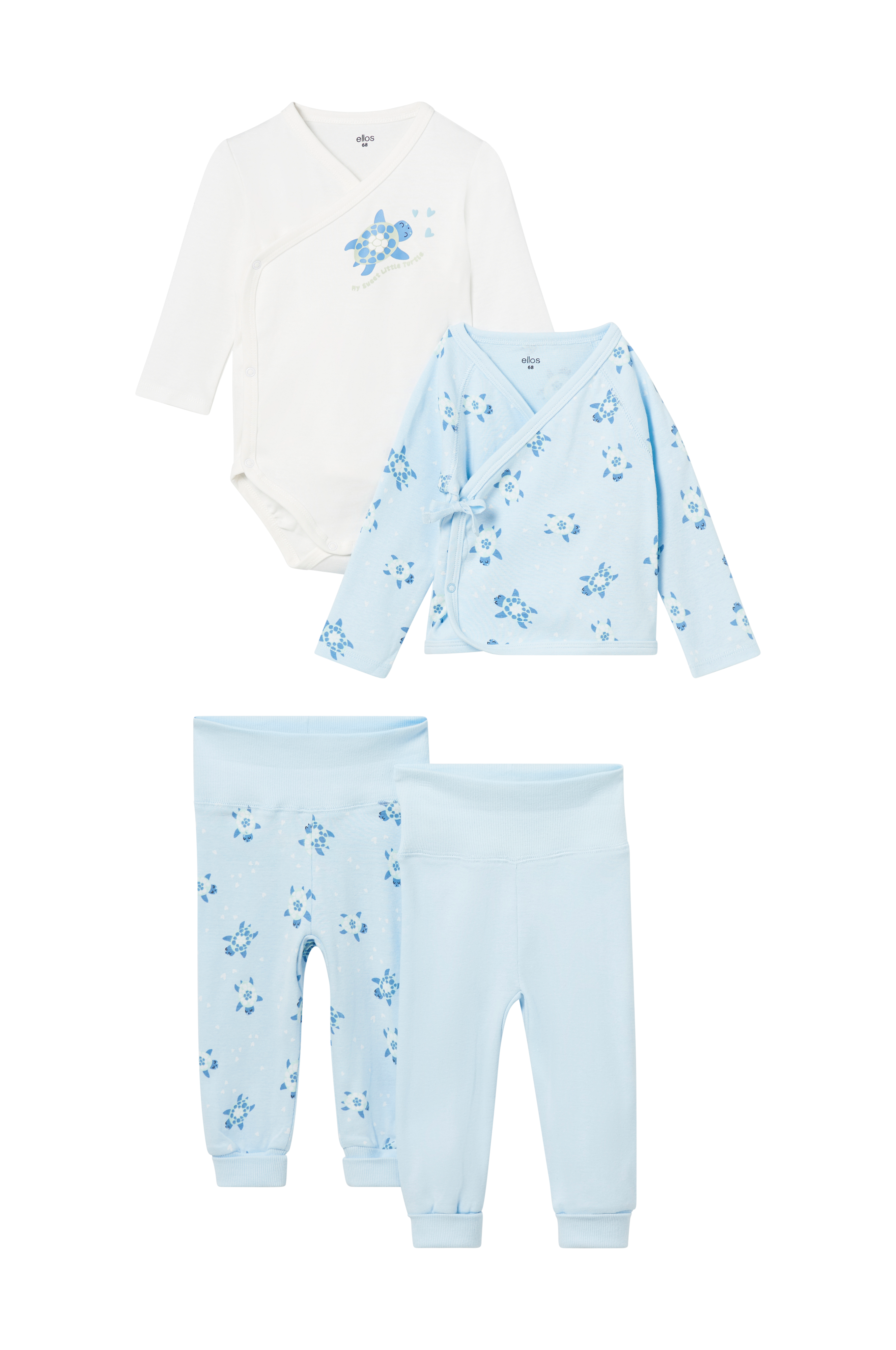 Startpakke eller gavesæt i 4 dele til babyens første tid. Blød økologisk bomuldsjersey.