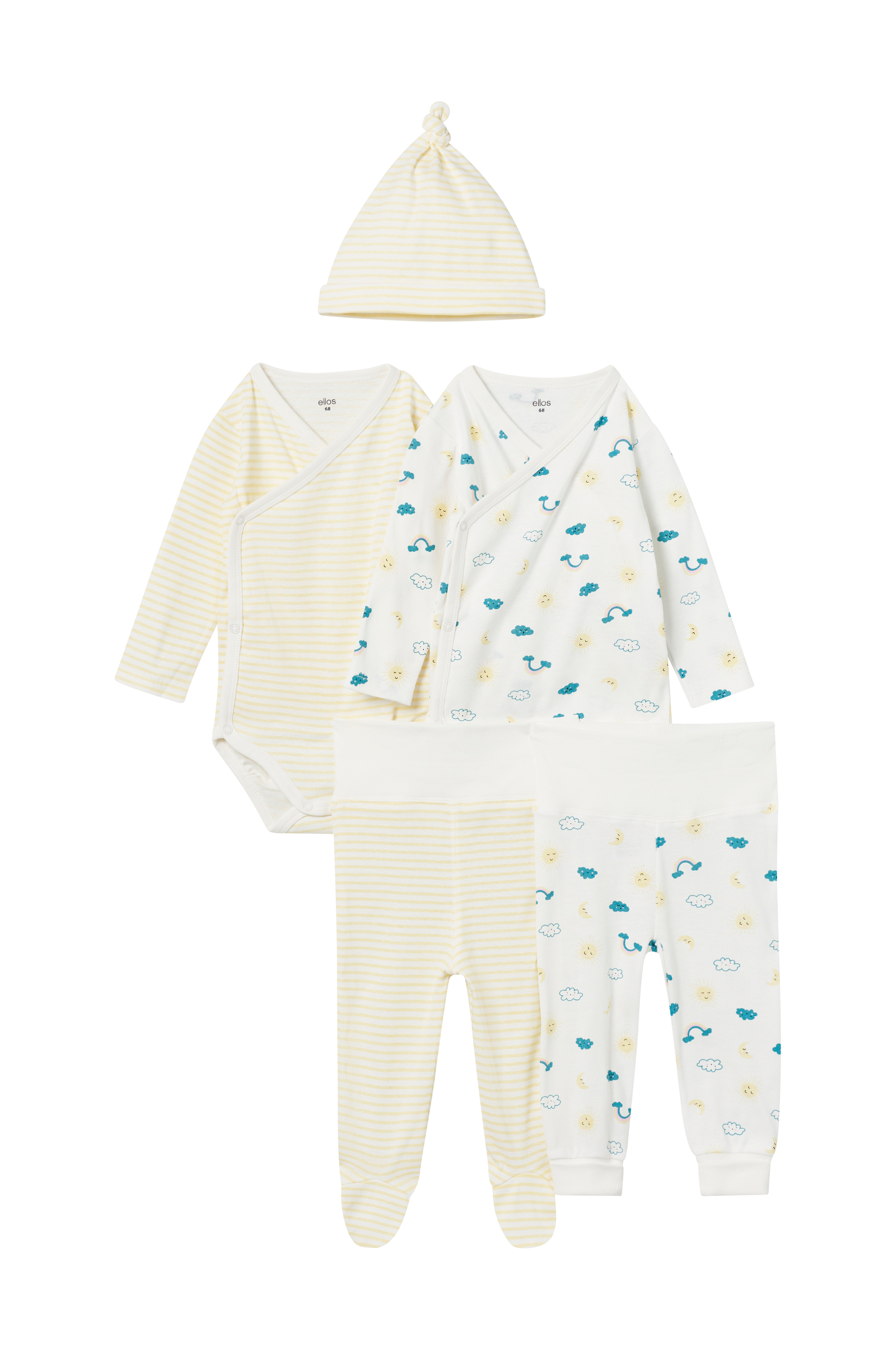 2 langærmede slå om-bodyer med trykknapper foran og i skridtet 1 pyjamas med fødder og trykknapper hele vejen ned til foden 1 par bukser med foldbar talje 1 hue med justerbar knude foroven