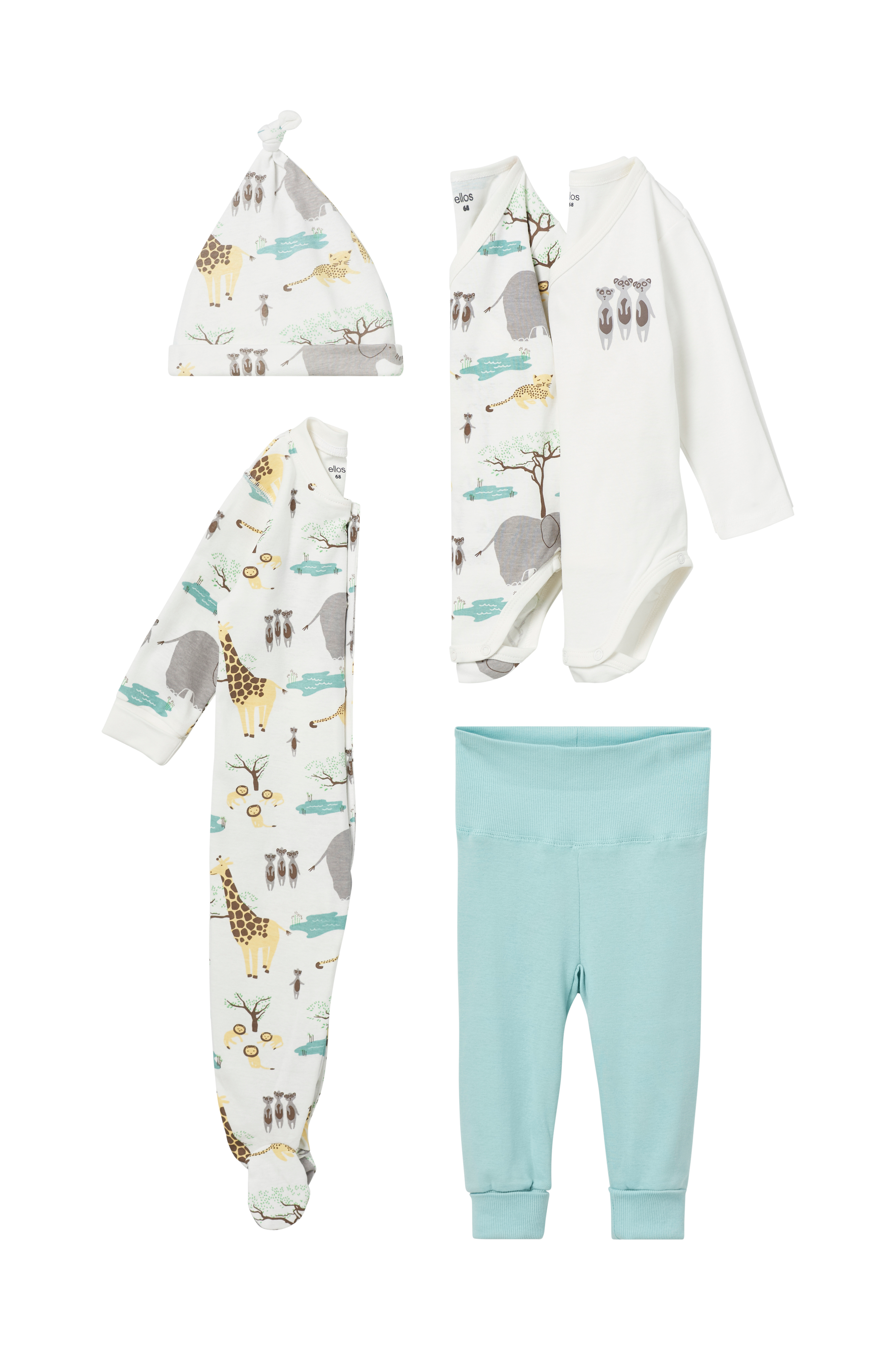 Startpakke eller gavesæt i 5 dele til barnets første tid. Tøjet er i blød jersey af økologisk bomuld.