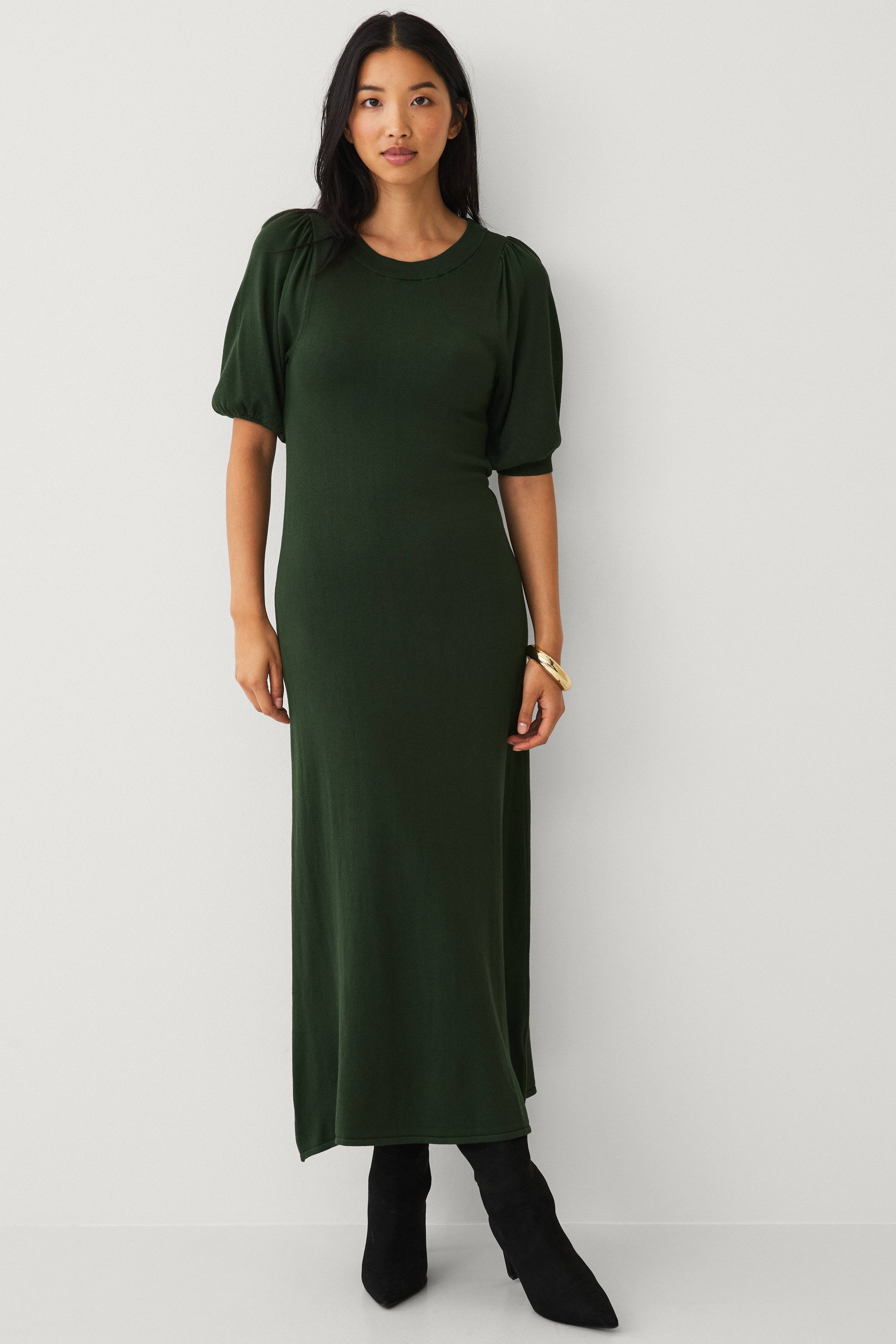 • Store størrelser• Fintstrikket kjole• Rund, ribstrikket halsudskæring• Halvlange ballonærmer• Smal pasform• Længde: 126 cm i størrelse 34/36