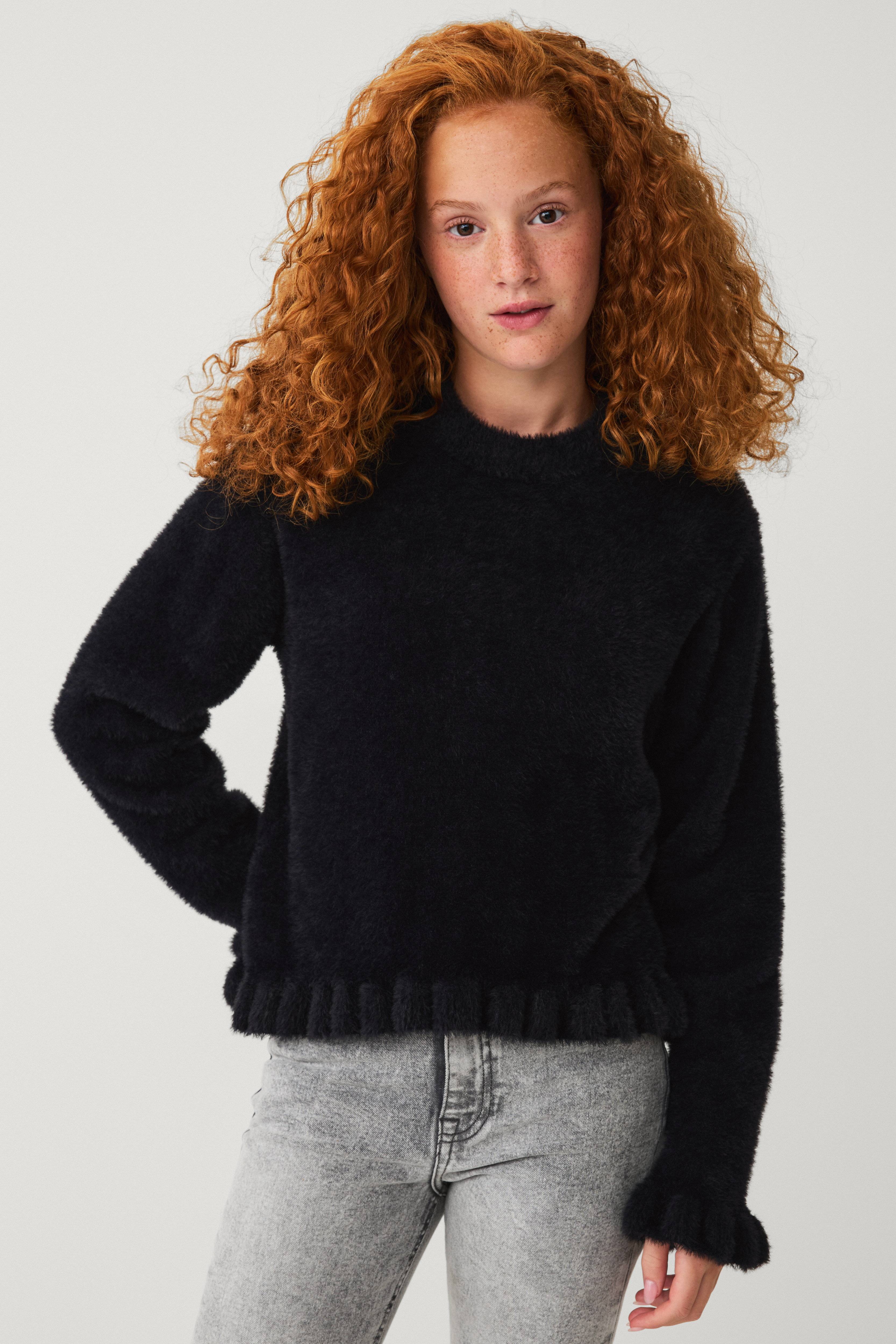 • Fintstrikket, blød trøje med rund, ribbet halsudskæring• Lange ærmer med volant ved manchetterne• Flæsekant nederst med lidt længere bagside