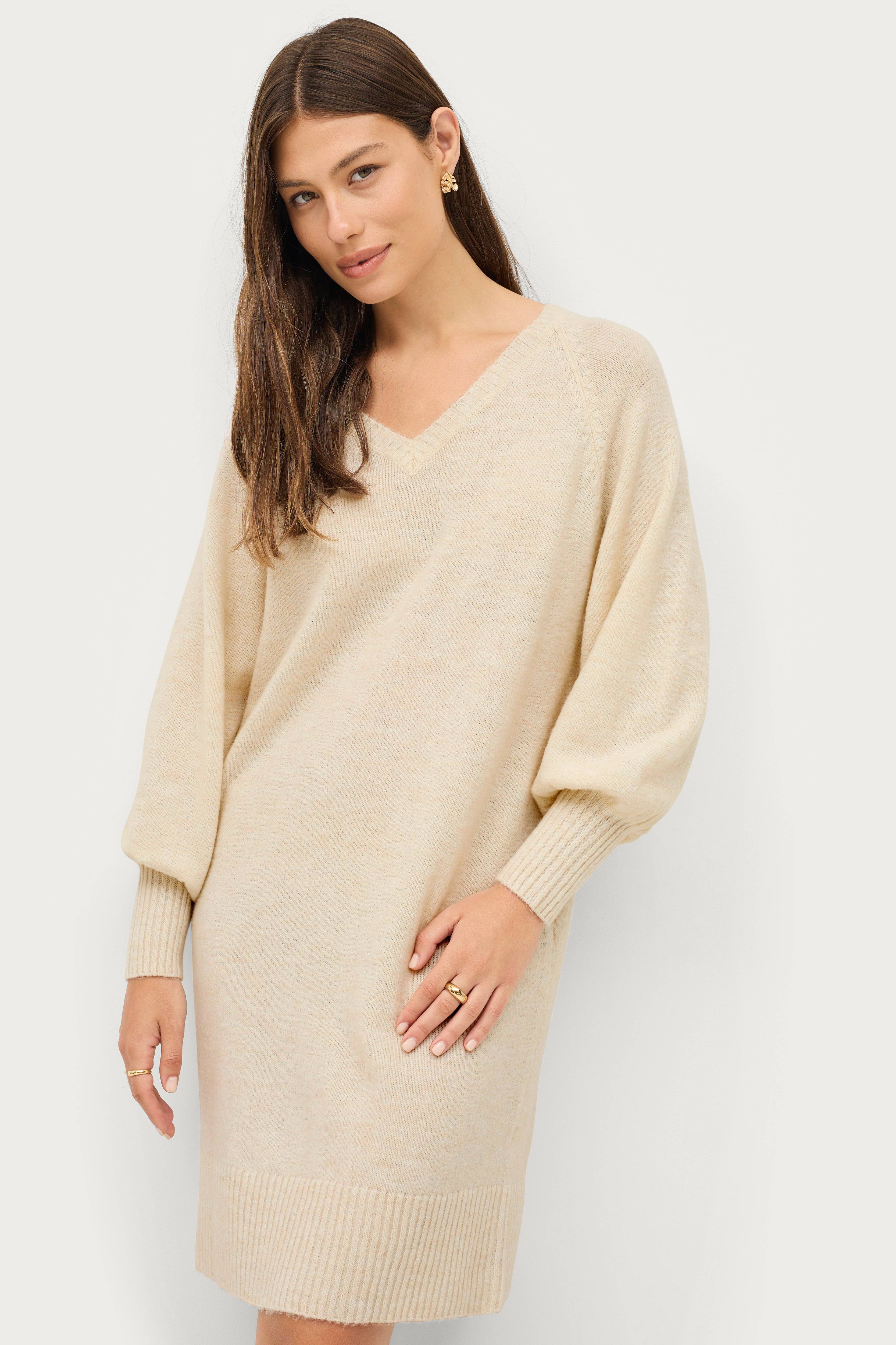 • Strikket kjole• V-udskæring• Lange raglanærmer• Ribstrikkede detaljer• Længde: 97 cm i størrelse 34/36