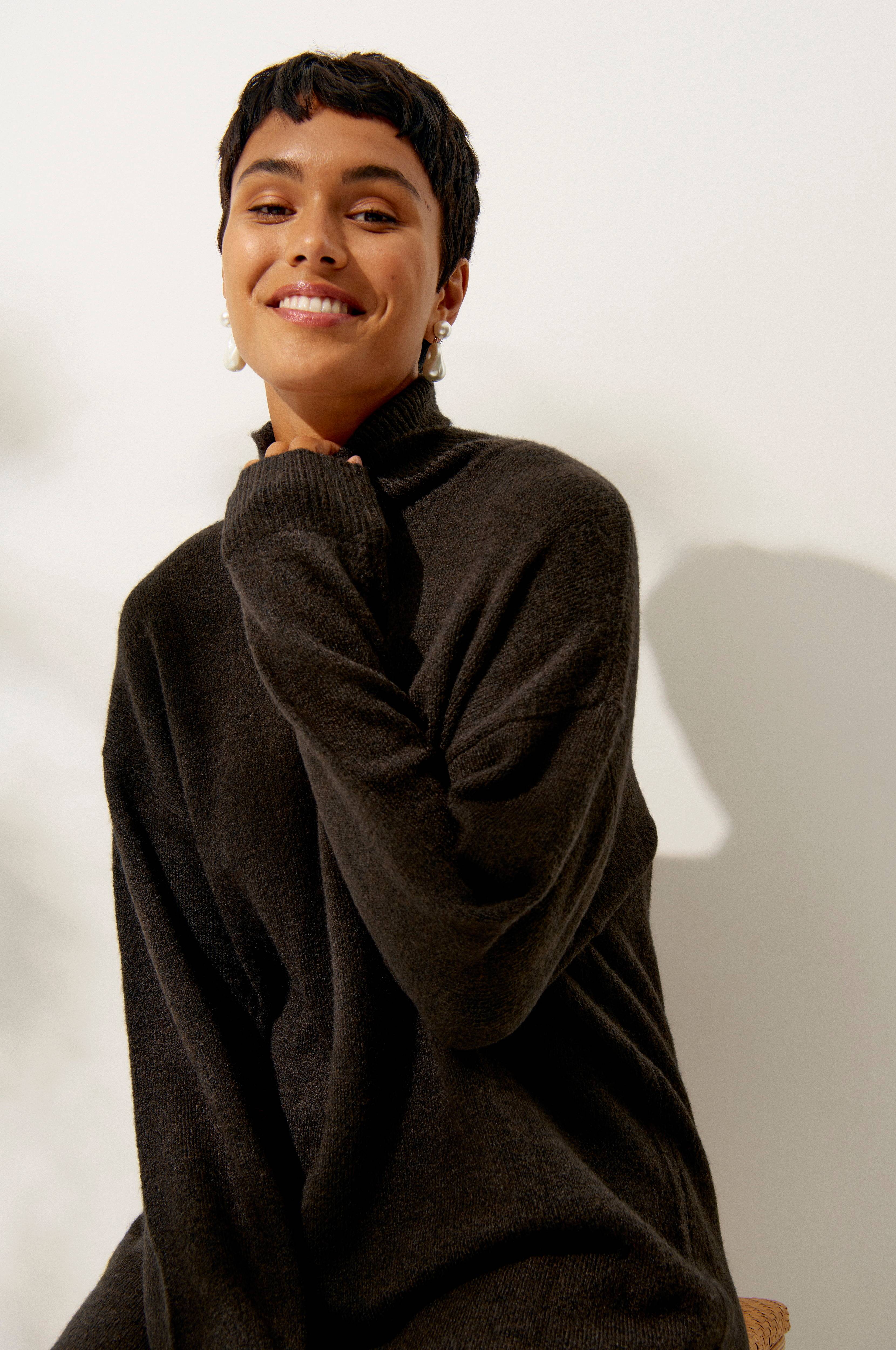 • Lige model • Nedsænkede skuldre • Ribbet polokrave • Blød, strikket kvalitet • Længde: 96 cm i størrelse 34/36 • Produktet indeholder genindvundet materiale, som genbruges for at reducere mængden af affald samtidigt med at der ikke anvendes nye ressourcer.