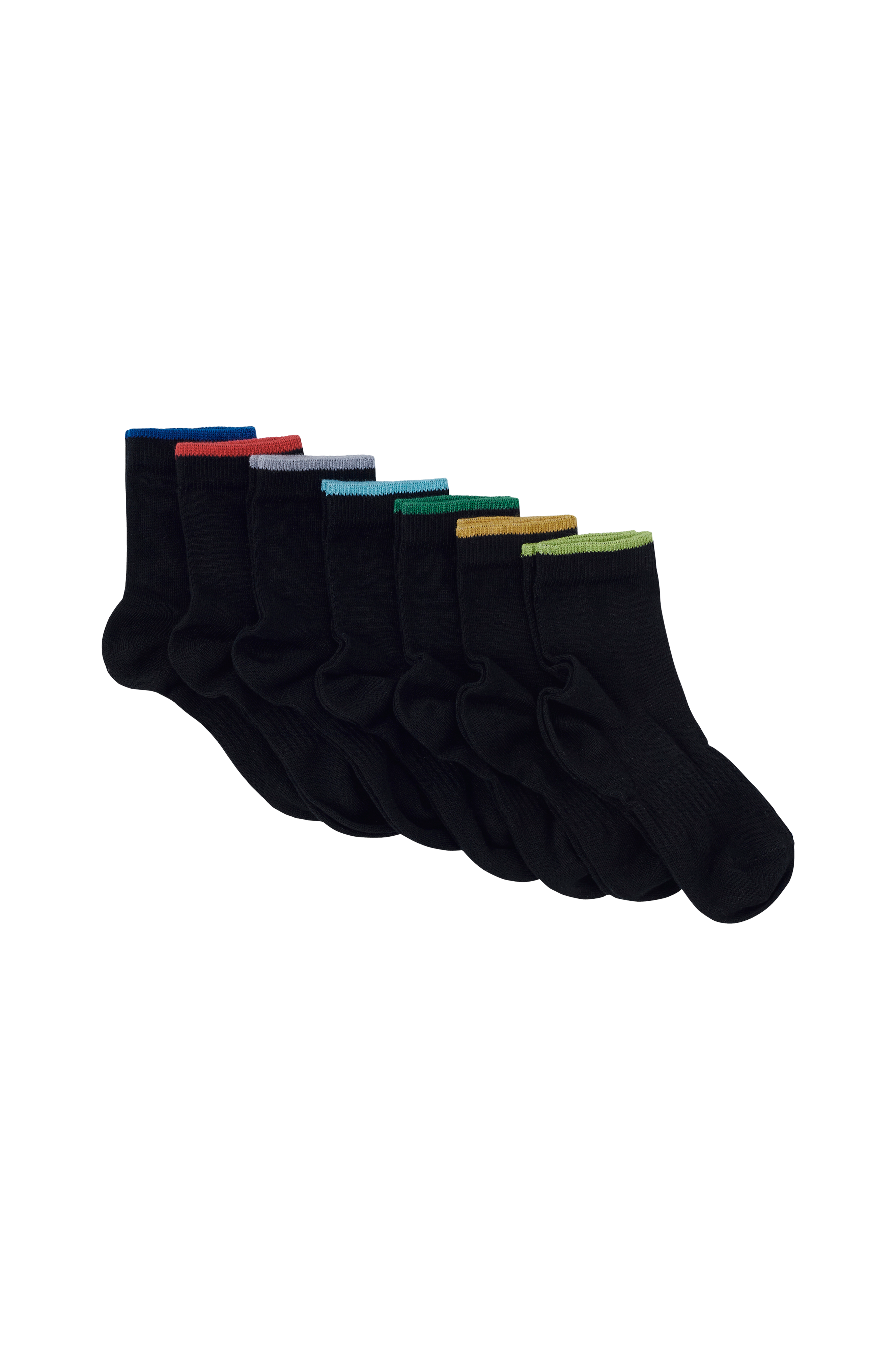 Strømper i bomuldsblanding med ribstrikket parti midt på foden og farvet ribkant foroven.