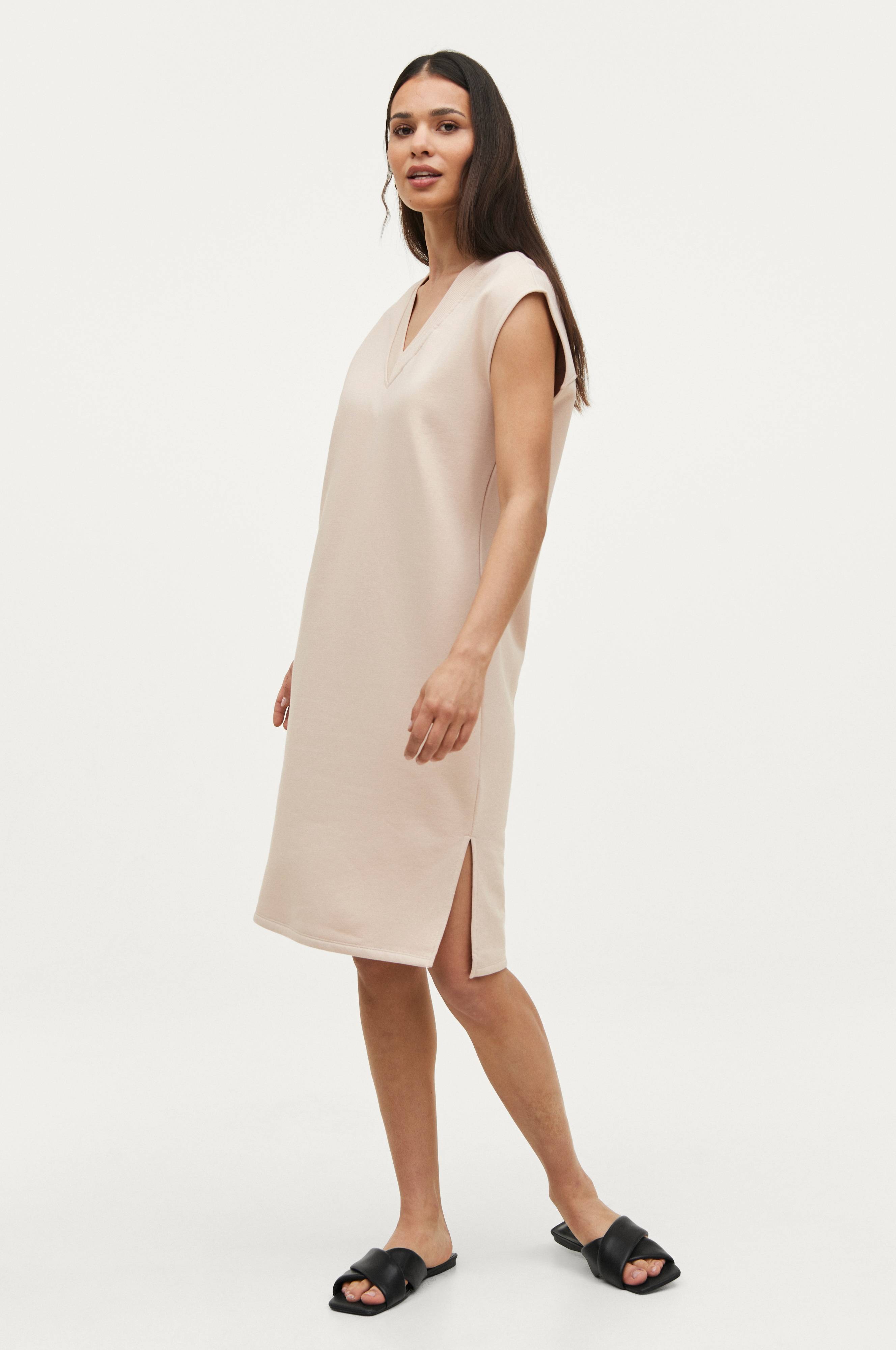 Ærmeløs, sporty kjole i bomuldsblanding med blød, børstet inderside. V-udskæring med ribkant foran og slidser i siderne forneden. Bærestykkesøm bagpå. Lige pasform. Længde ca. 105 cm i str. 34/36.