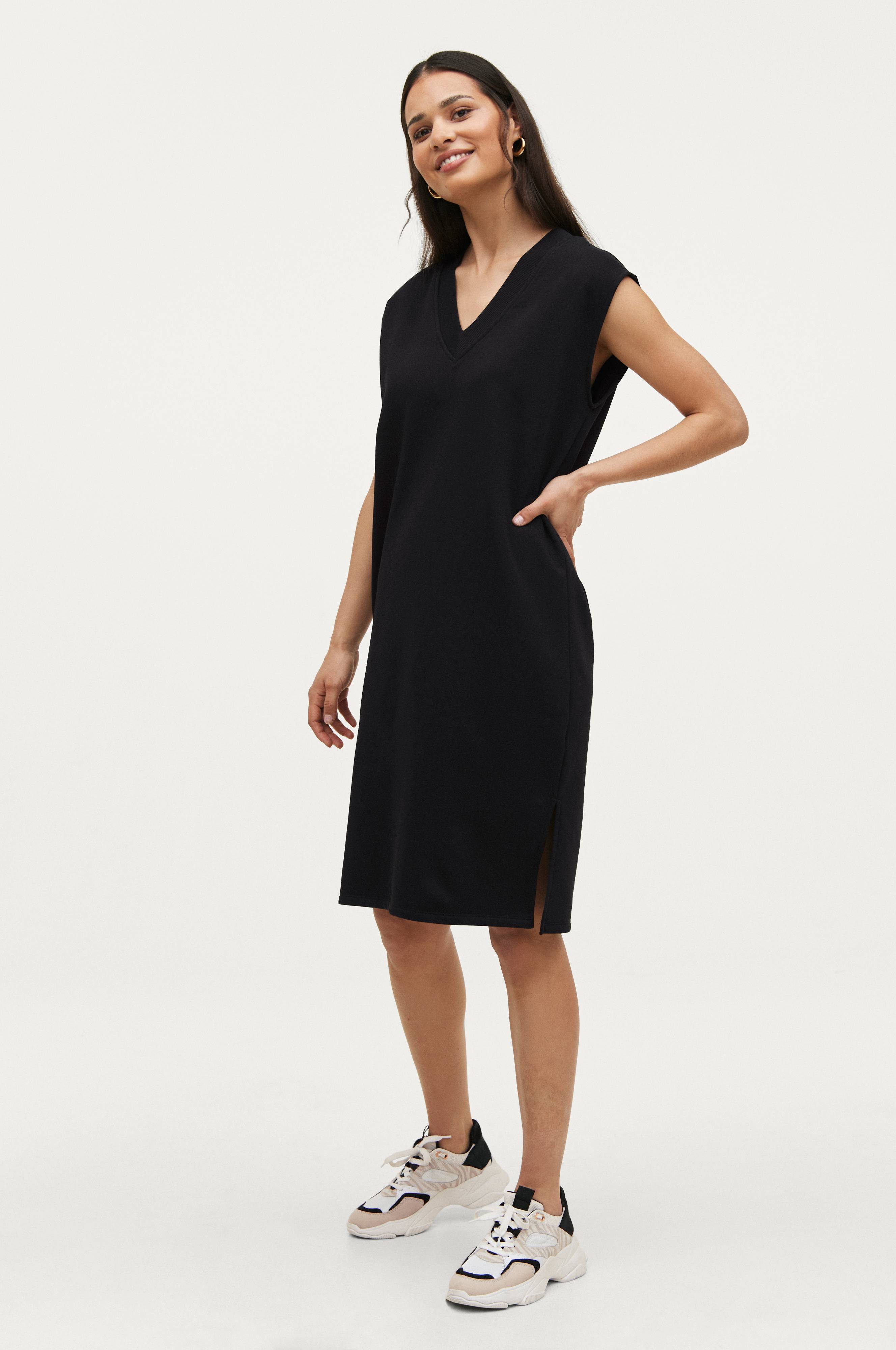 Ærmeløs, sporty kjole i bomuldsblanding med blød, børstet inderside. V-udskæring med ribkant foran og slidser i siderne forneden. Bærestykkesøm bagpå. Lige pasform. Længde ca. 105 cm i str. 34/36.