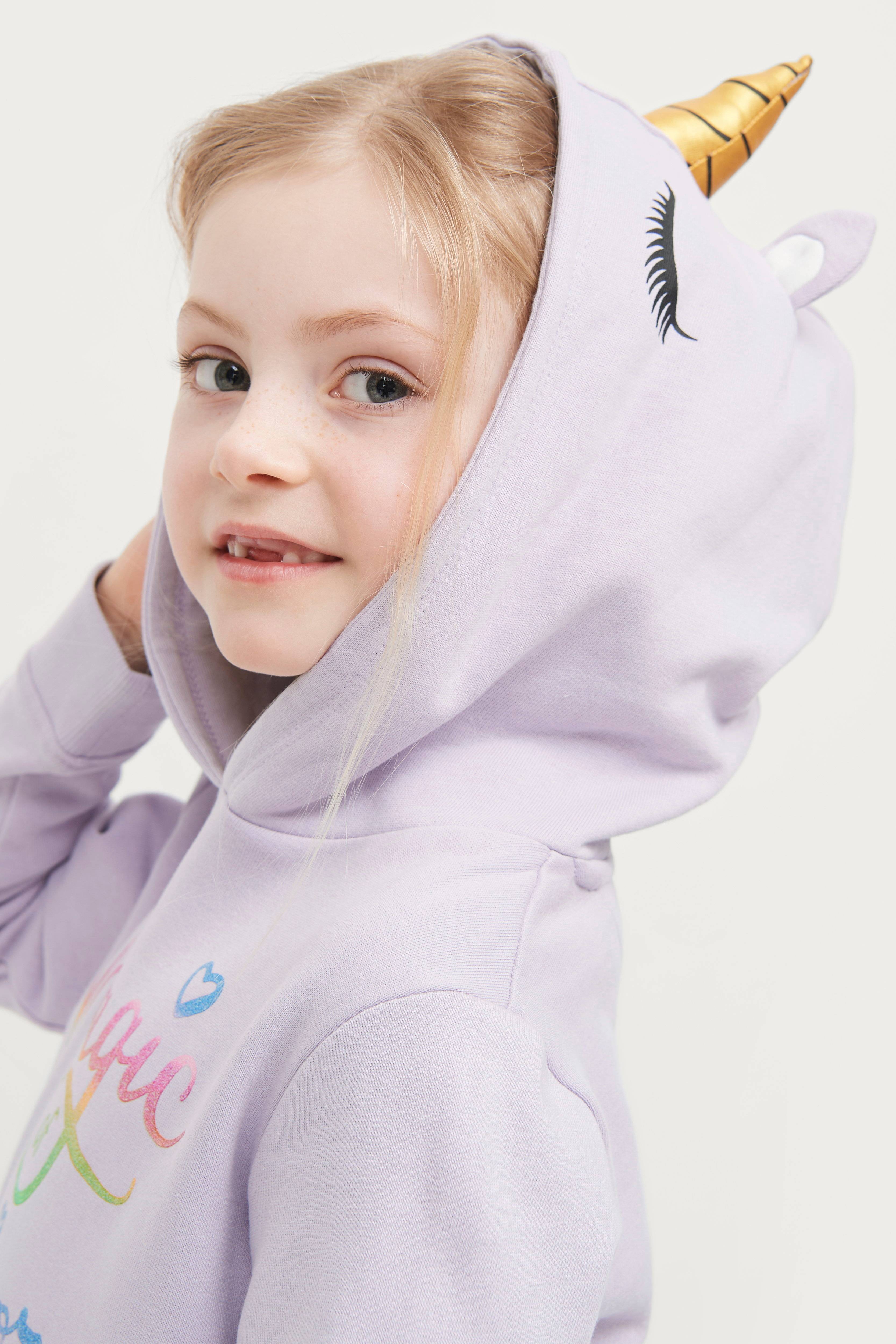 Enhjørningekjole i skønne farver med tekstprint foran og hætte med påsyede ører og horn. Ribkant i ærmekant.