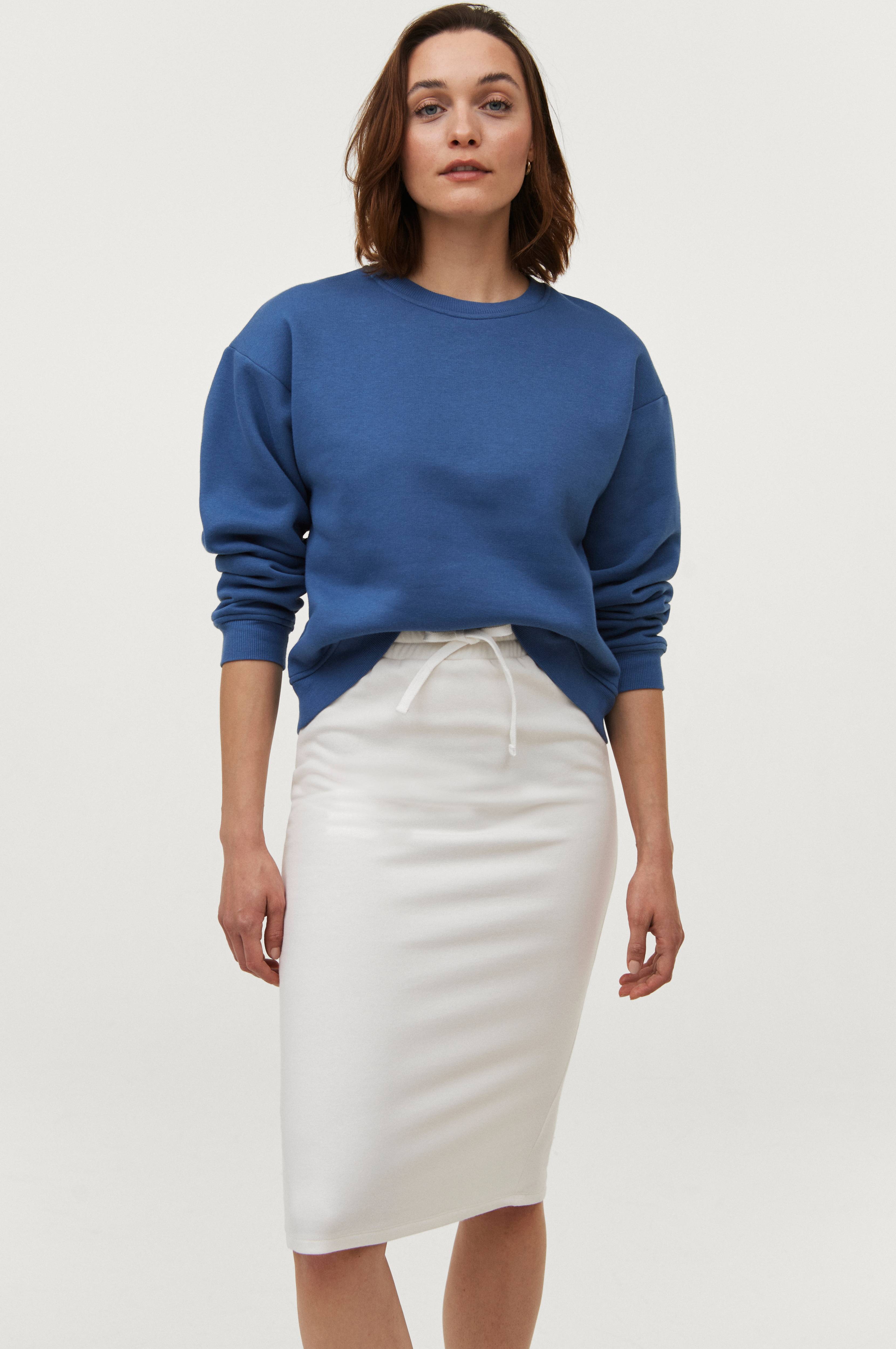 Sporty pencilnederdel i sweatkvalitet af bomuld med blød, børstet inderside. Elastisk talje med løbegang og slids i kanten forneden bagpå. Længde ca. 71 cm i str. 34/36.