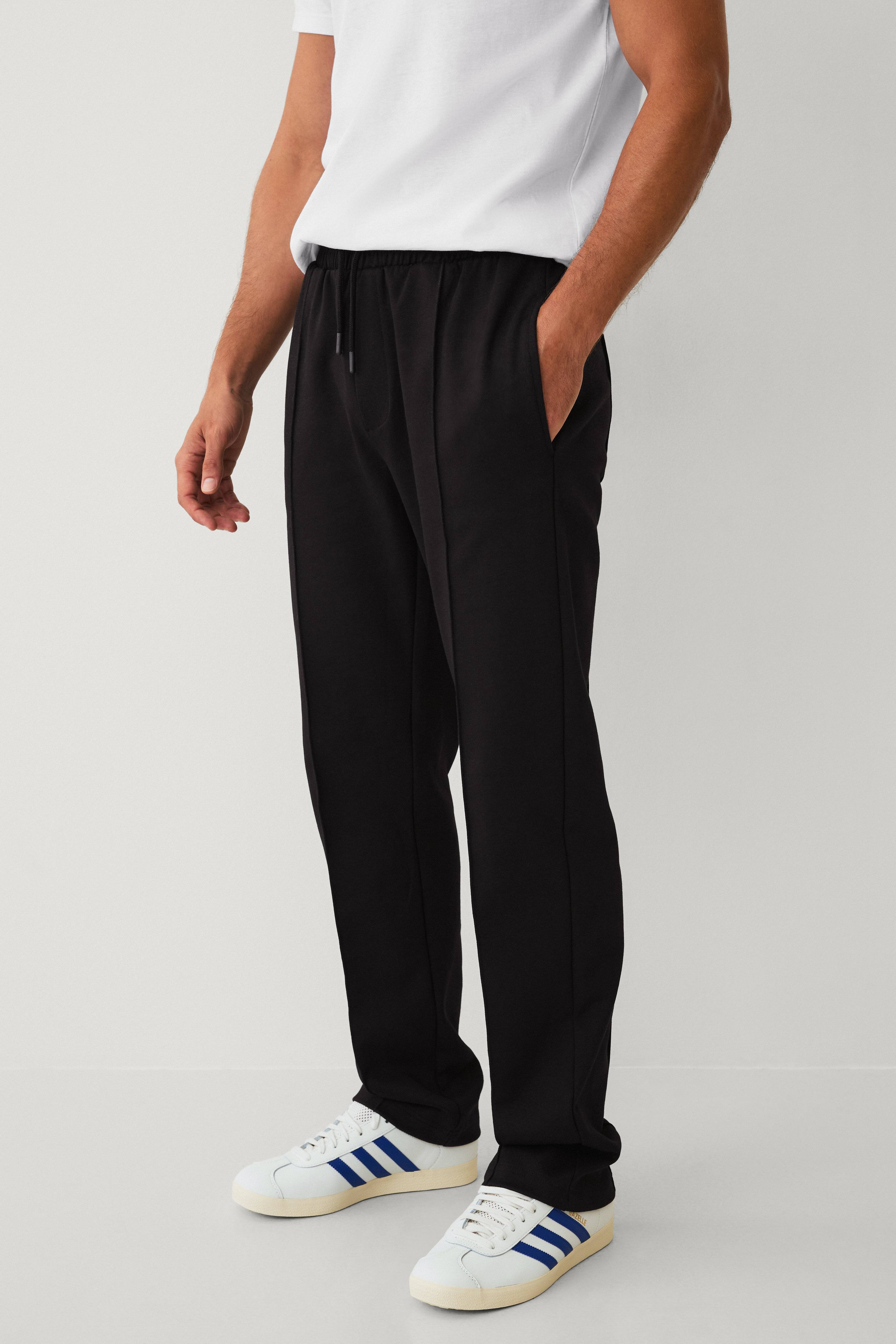 • Model i sweatshirt-kvalitet• Lige ben med syede pressefolder foran og bagpå• Elastisk linning med træksnørre• Sidelommer• Snydegylp• Baglomme