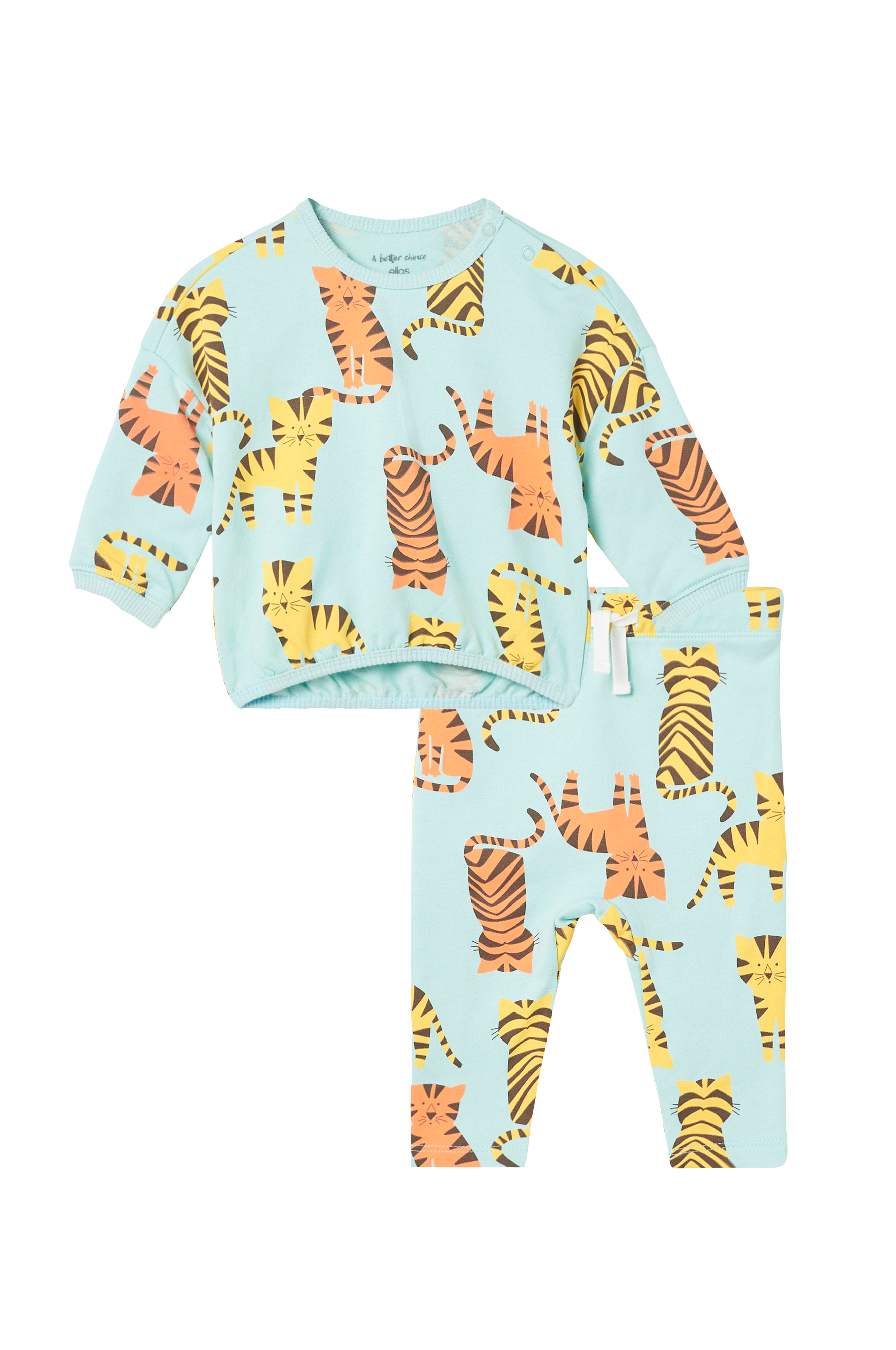 Sæt med trøje og bukser i tynd sweatkvalitet med blødt børstet inderside. Trykknapper på den ene skulder og ribkant i hals, ærmekant og kant forneden. Bukser med løbegang i taljen.