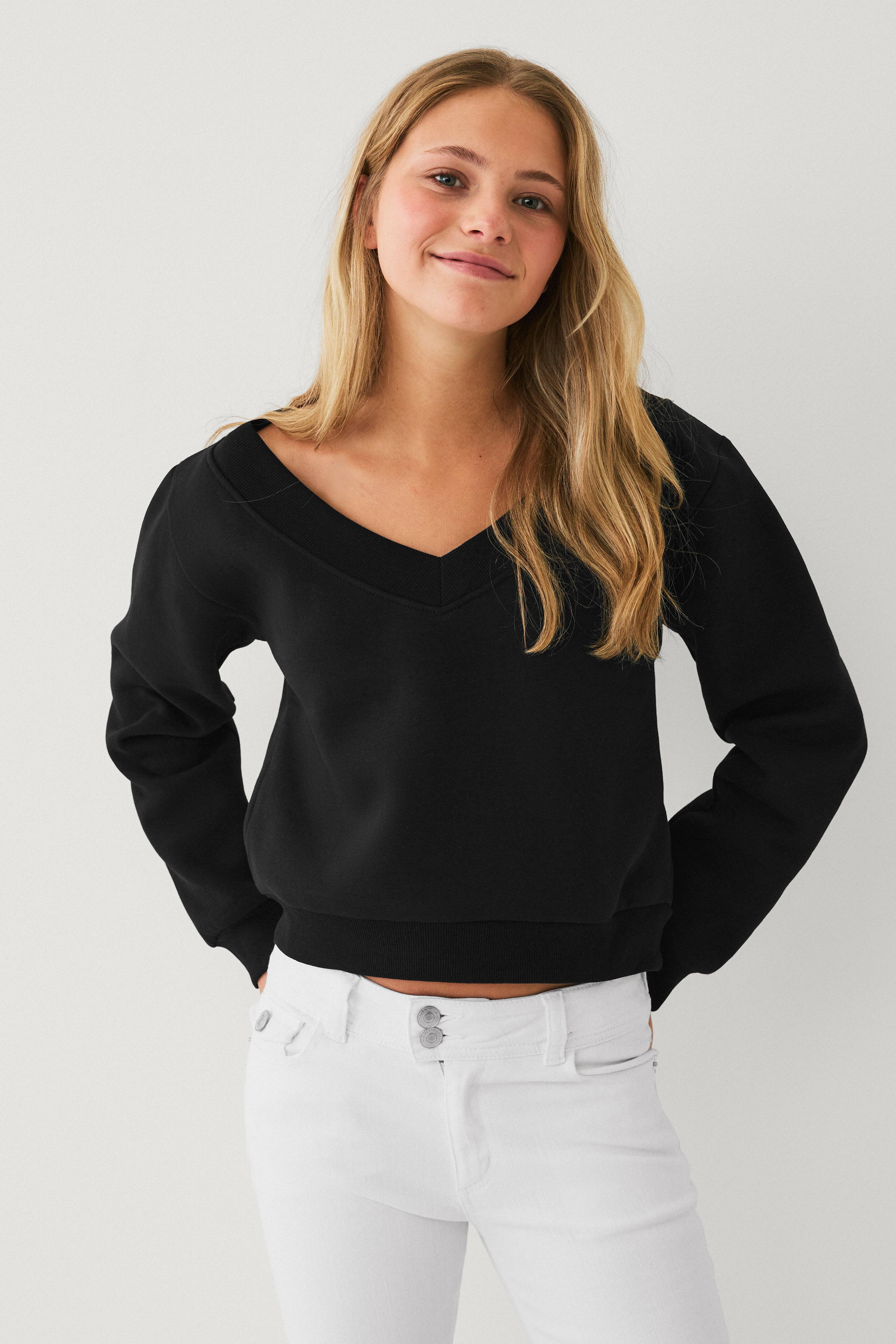 • V-formet, bred halsudskæring med ribmanchet