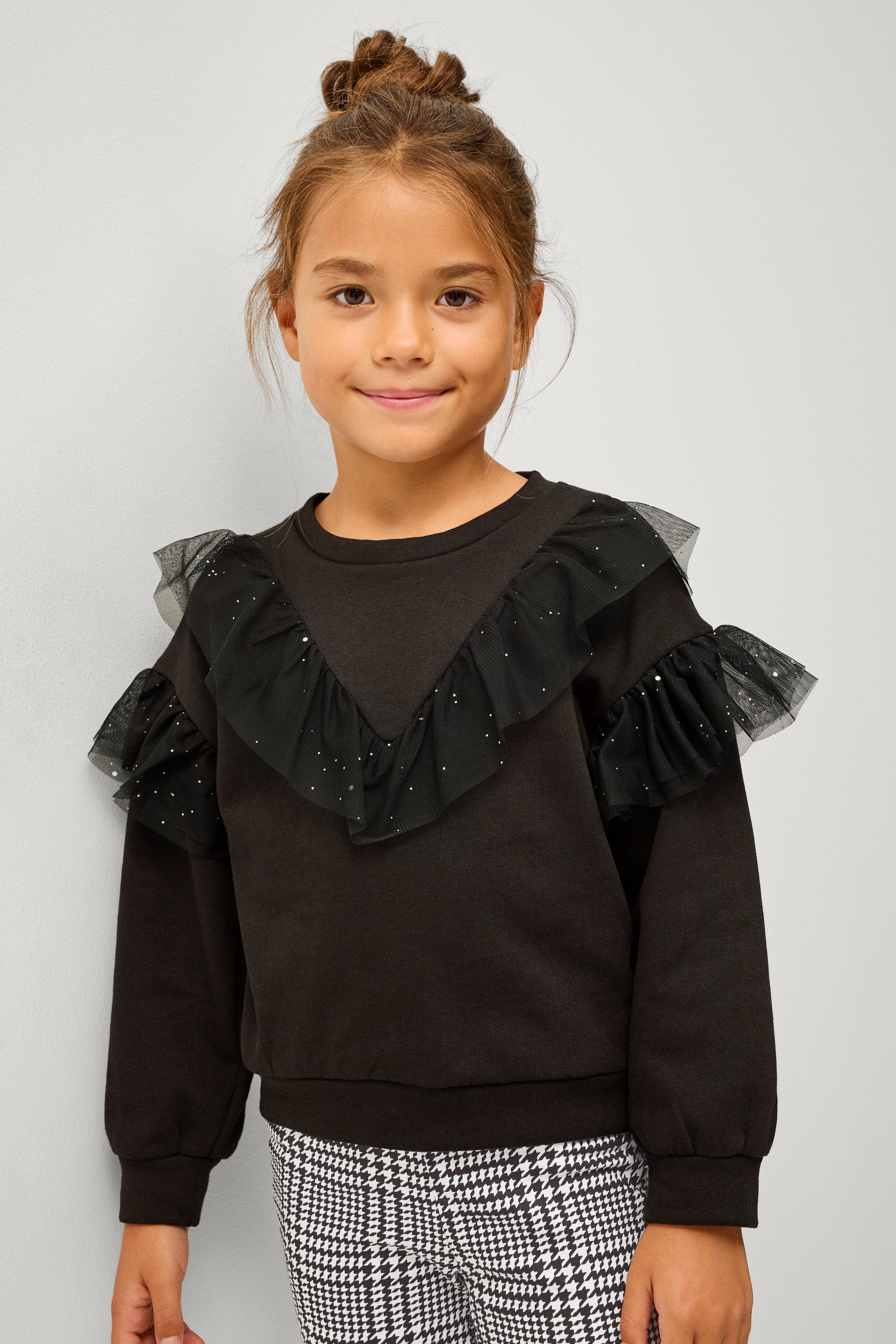 • Glitrende volanter i mesh foran og omkring ærmerne
