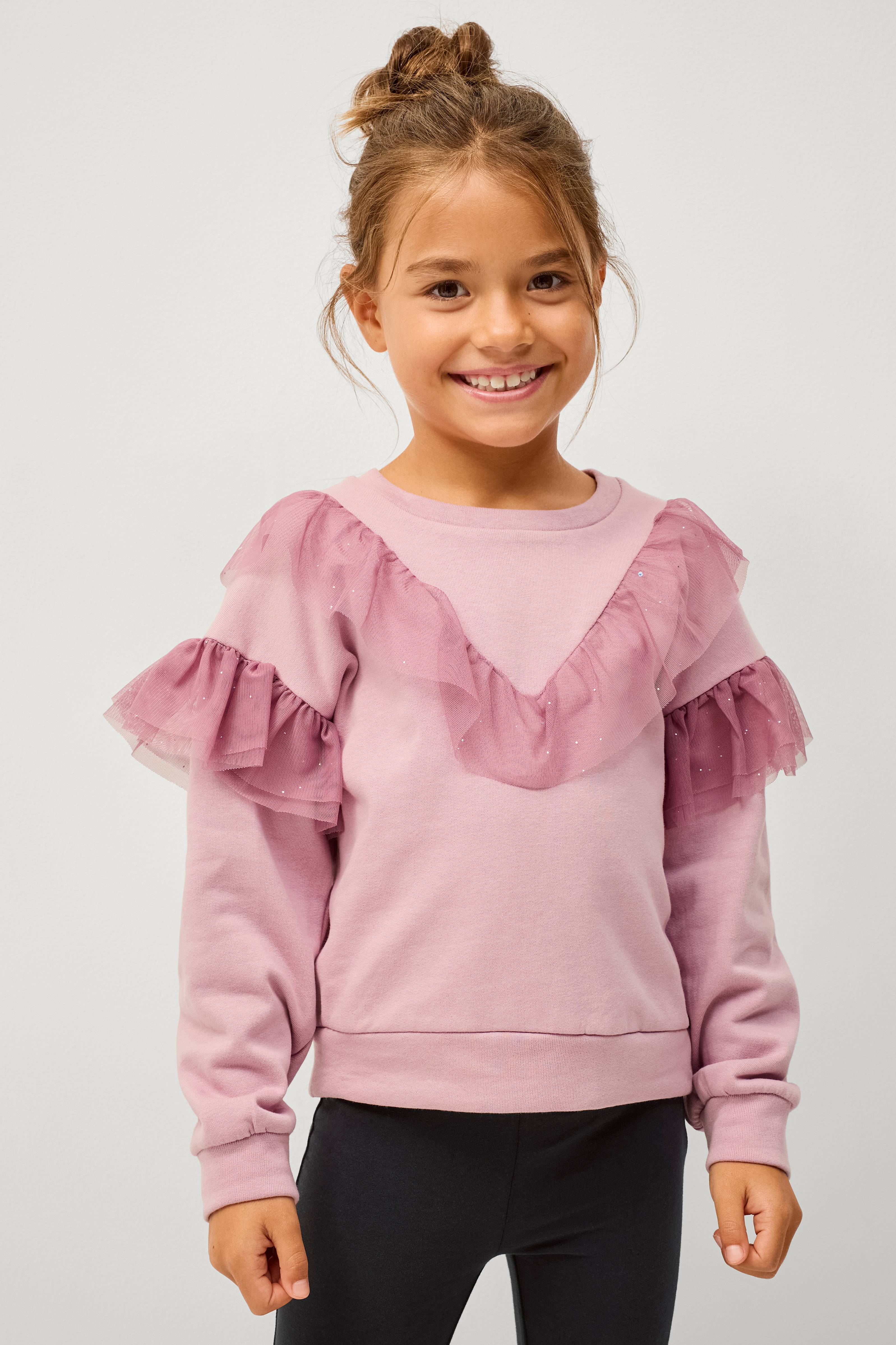• Glitrende volanter i mesh foran og omkring ærmerne