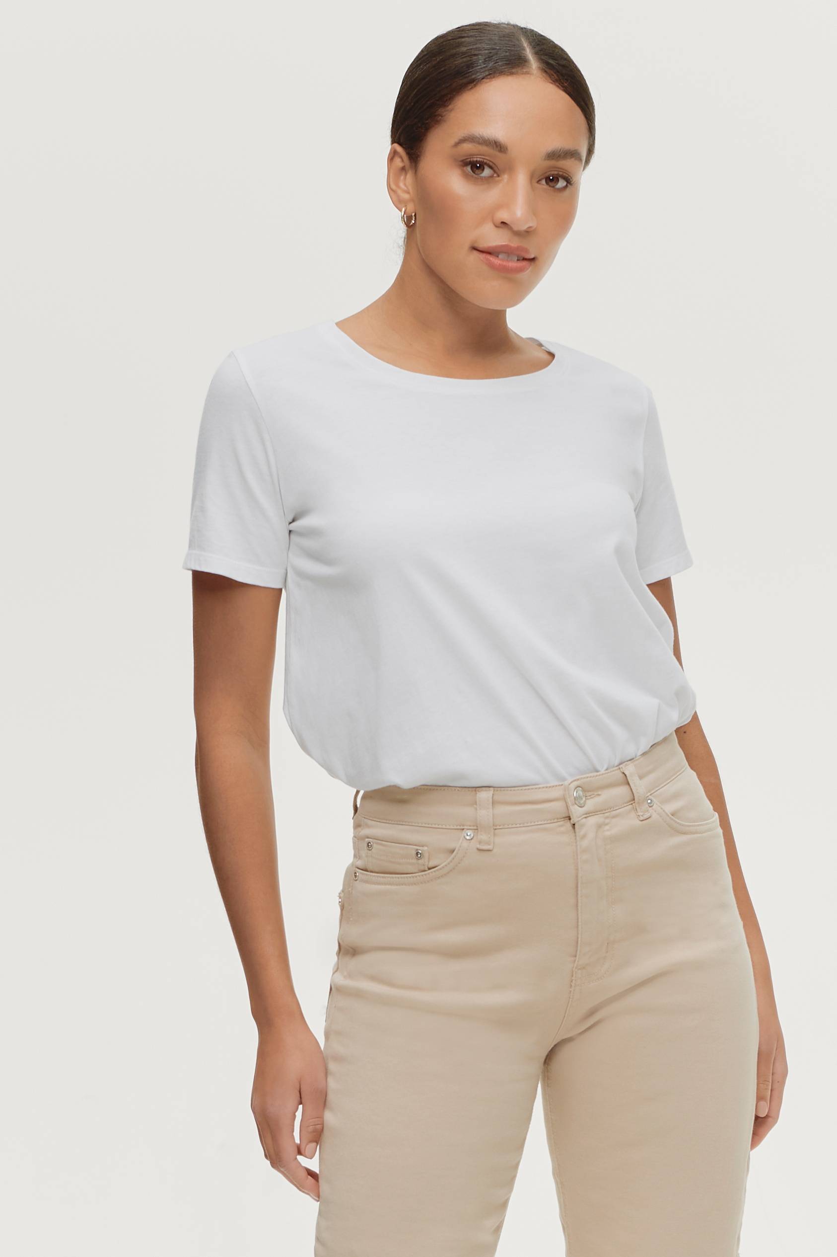 T shiiten er hvid og bevarer formen efter vask. Mkt vellykket køb